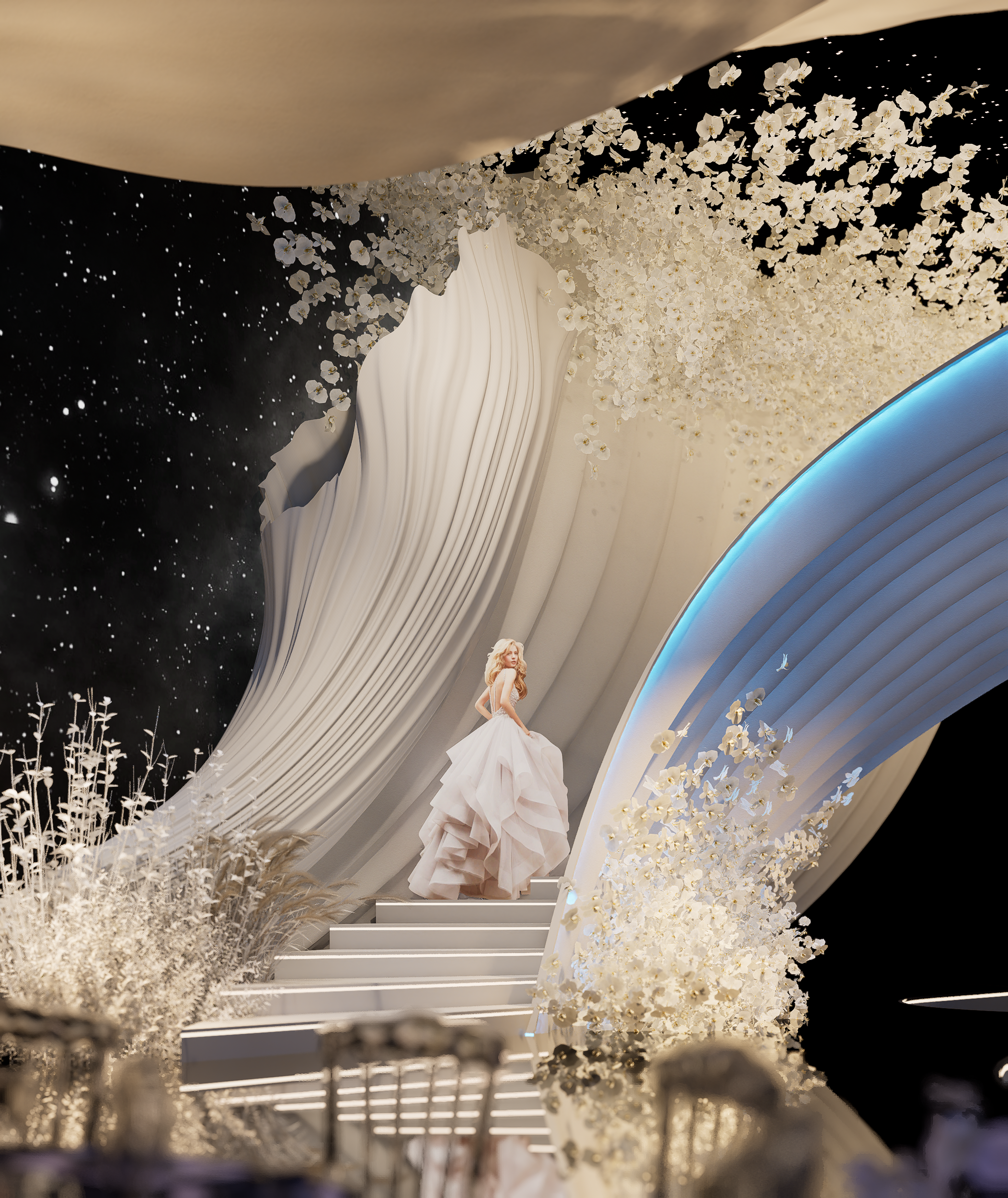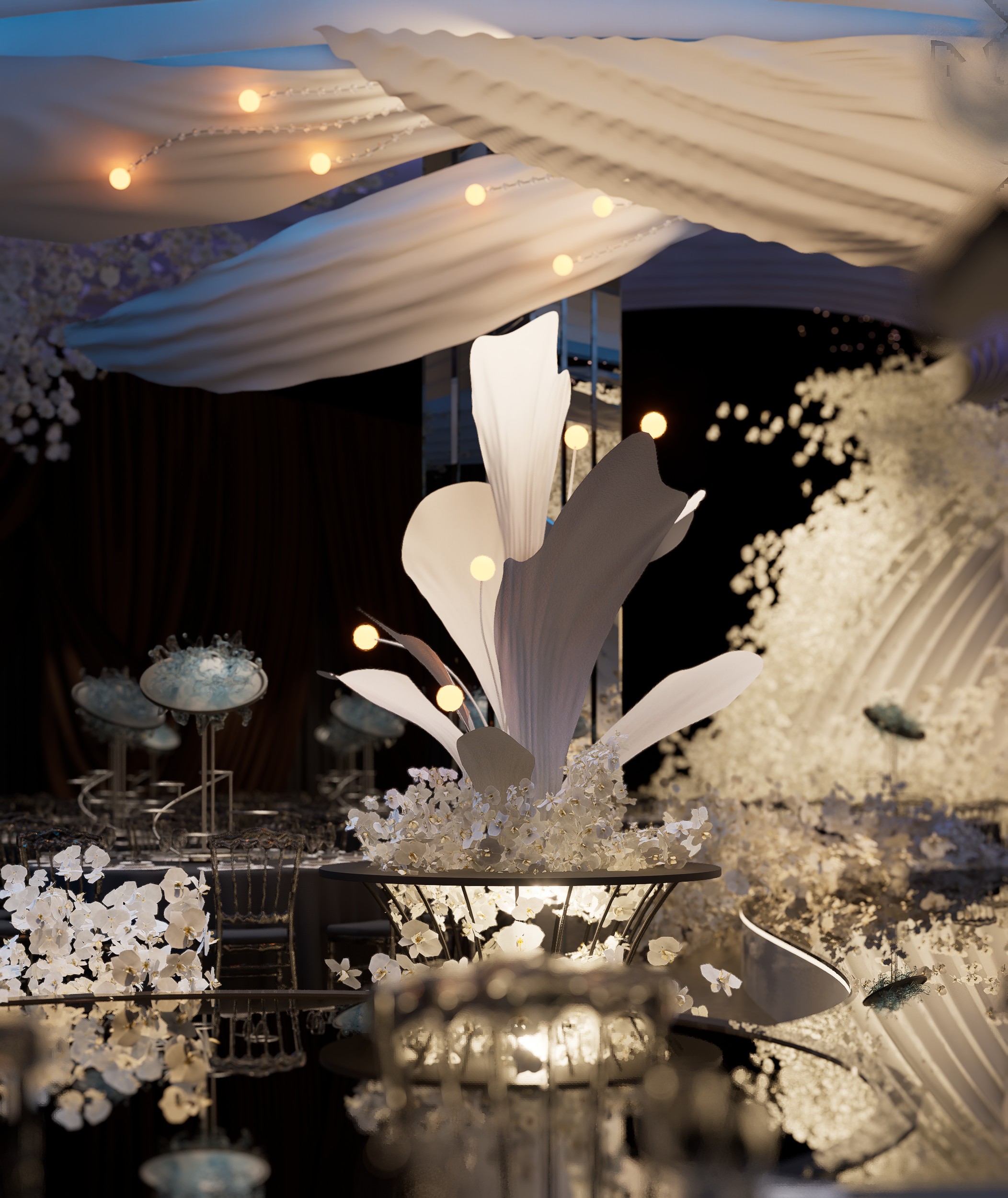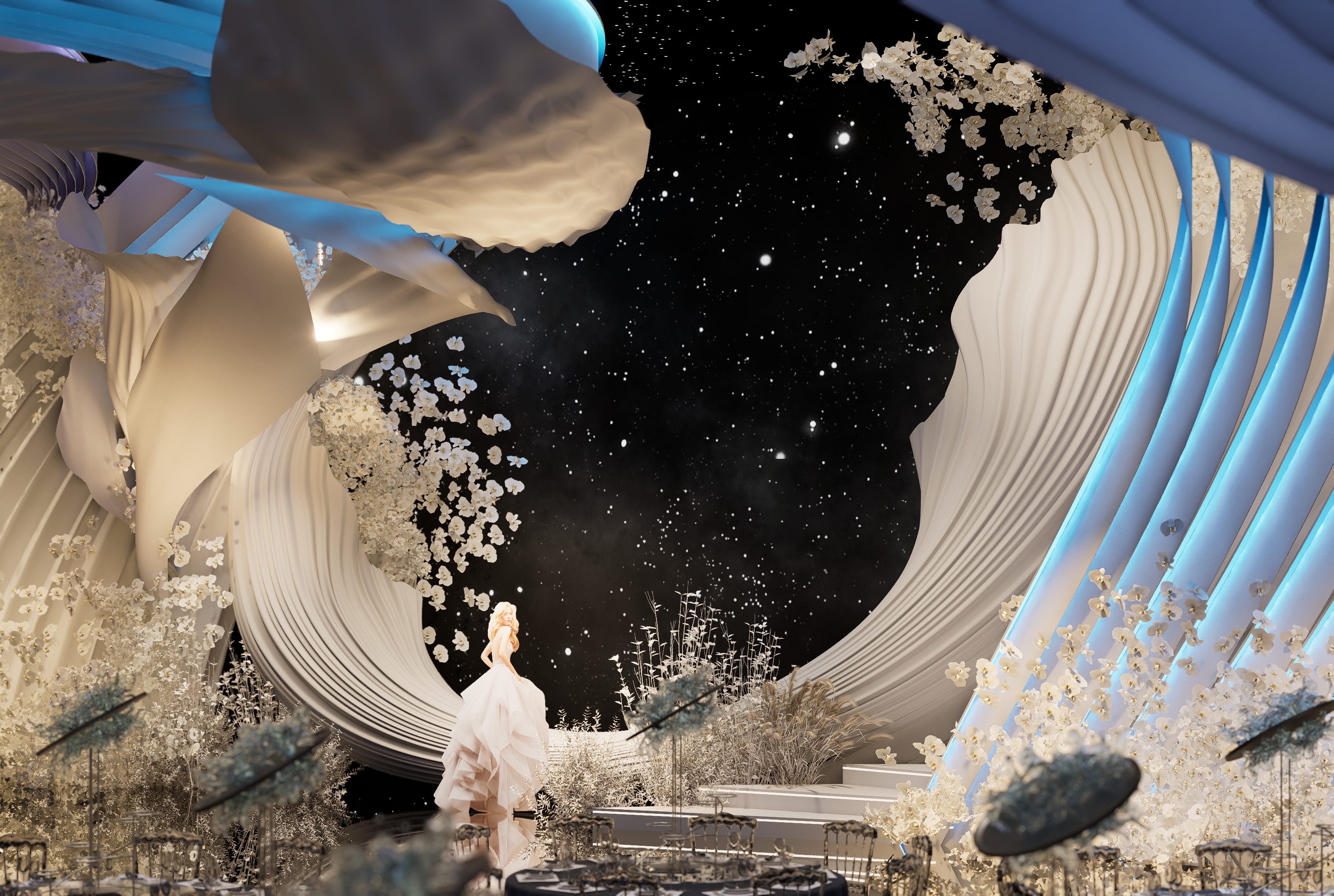李远杭将宴会空间设计成一场现代艺术展,在通透的现代感上,以“海浪”构建出“无形之美”,无边无际,浪漫自由。