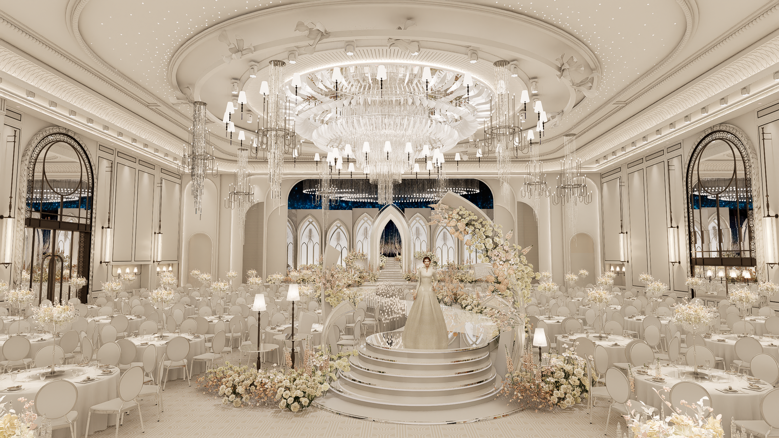 大宴会厅独特的吊顶造型,给新人提供了无限多的可能性。更多的定制可能和个性化需求可以得到满足,同时也能承接各种大型主题宴。