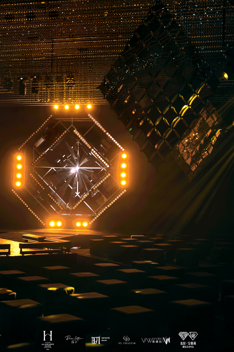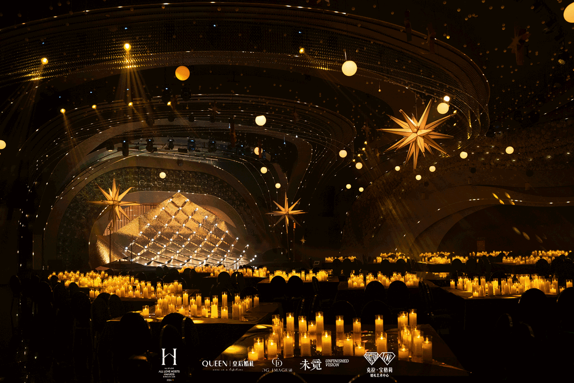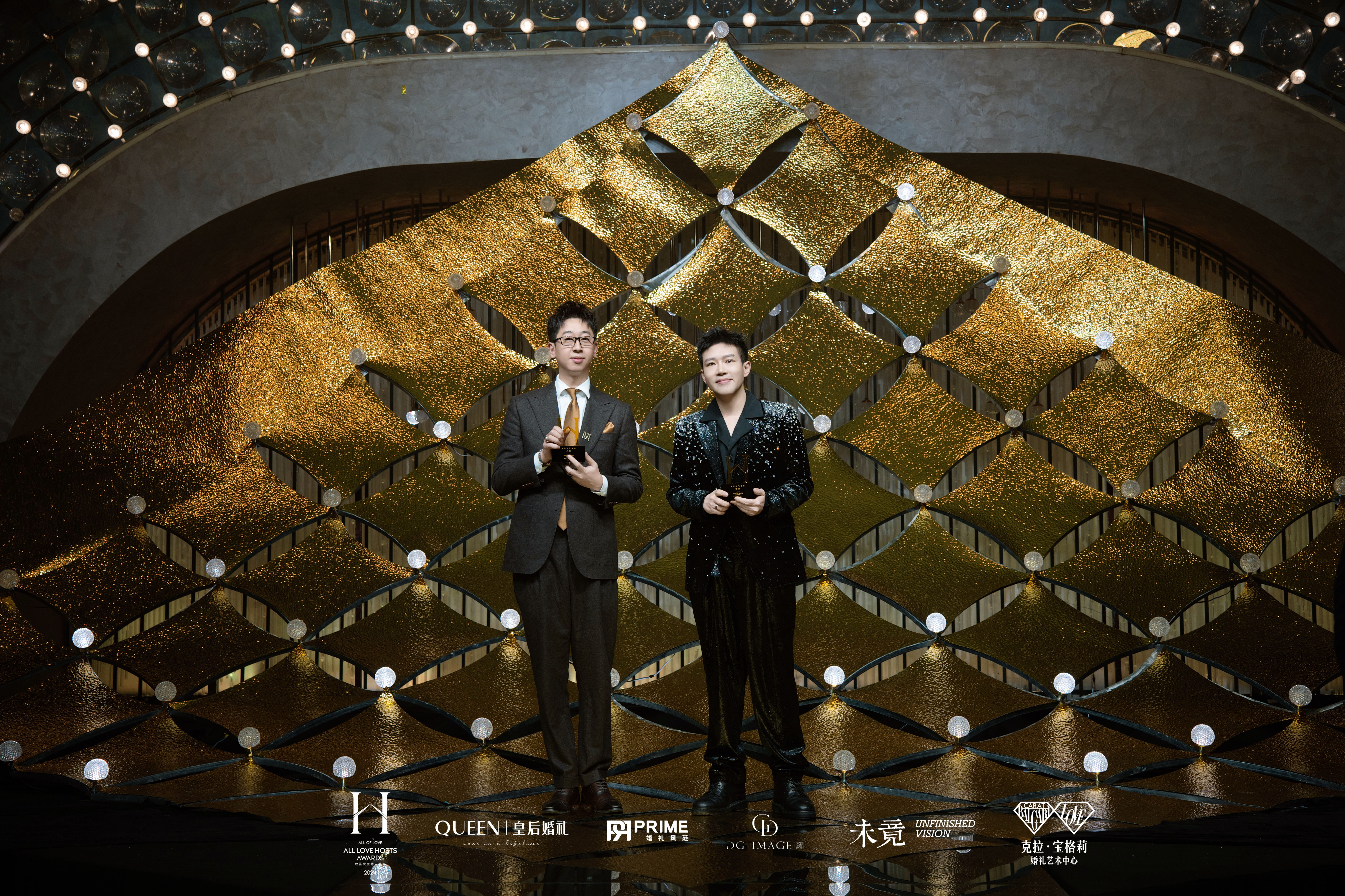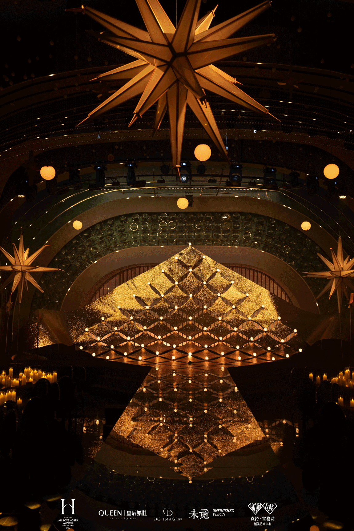 皇后婚礼联合创始人 古曰 x 克拉·宝格莉联合创始人 段寶寶联合创作的宴会厅“金色奥斯卡”。