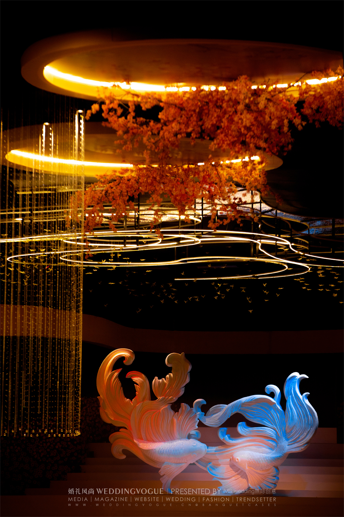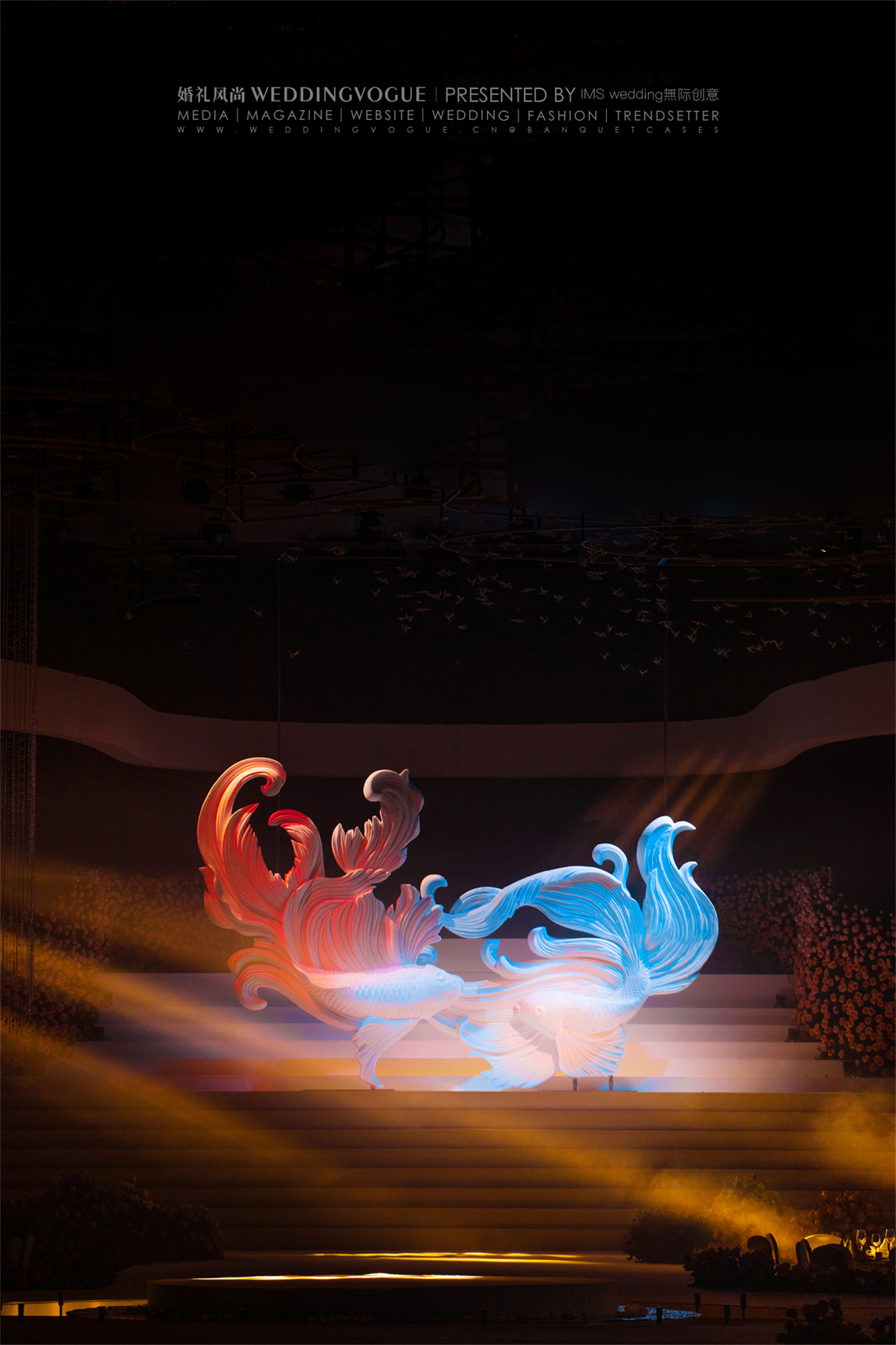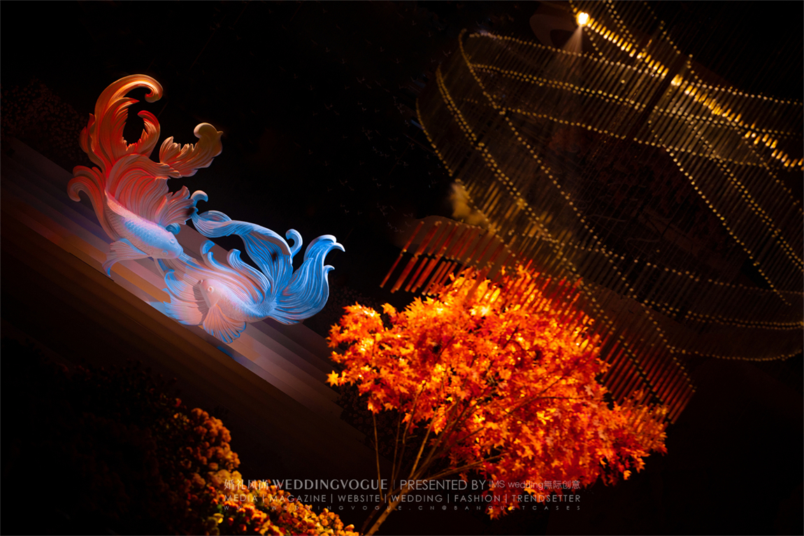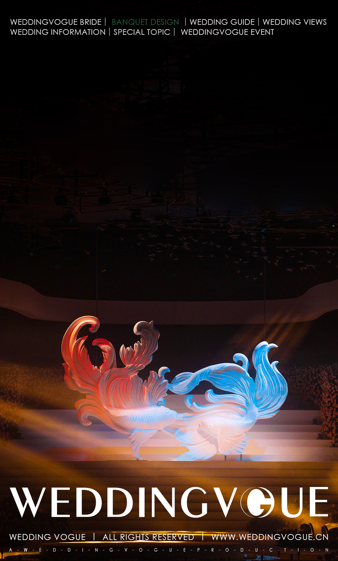 于是,设计师将秀场风融入中式场景色,主背景用了两条代表爱情忠贞和寓意招财旺运、提振家运象征的斗鱼。