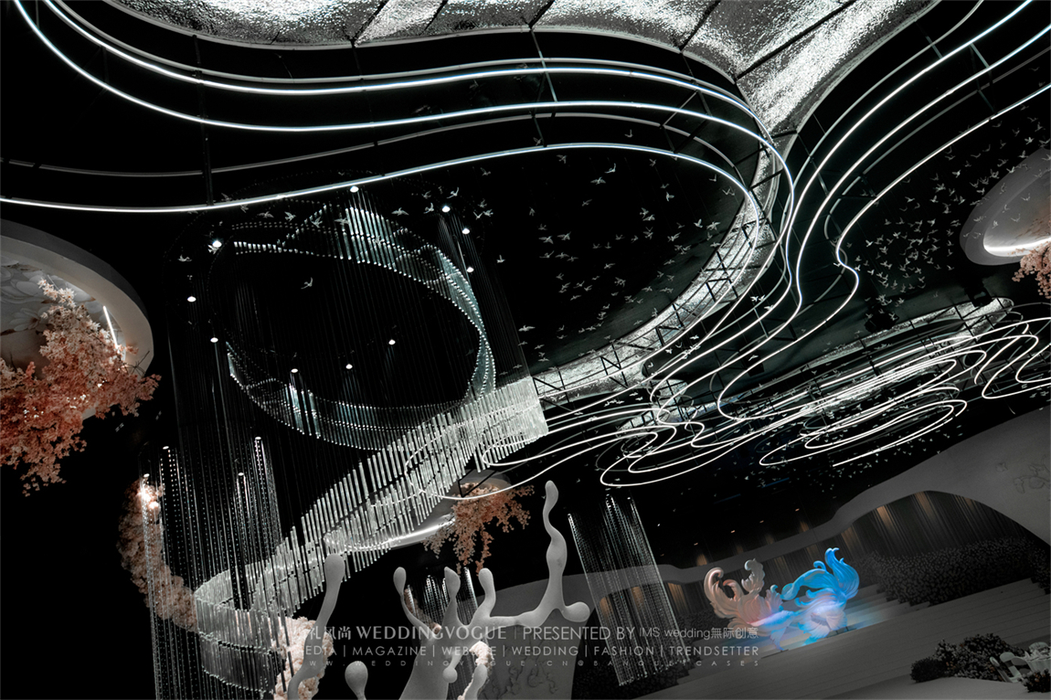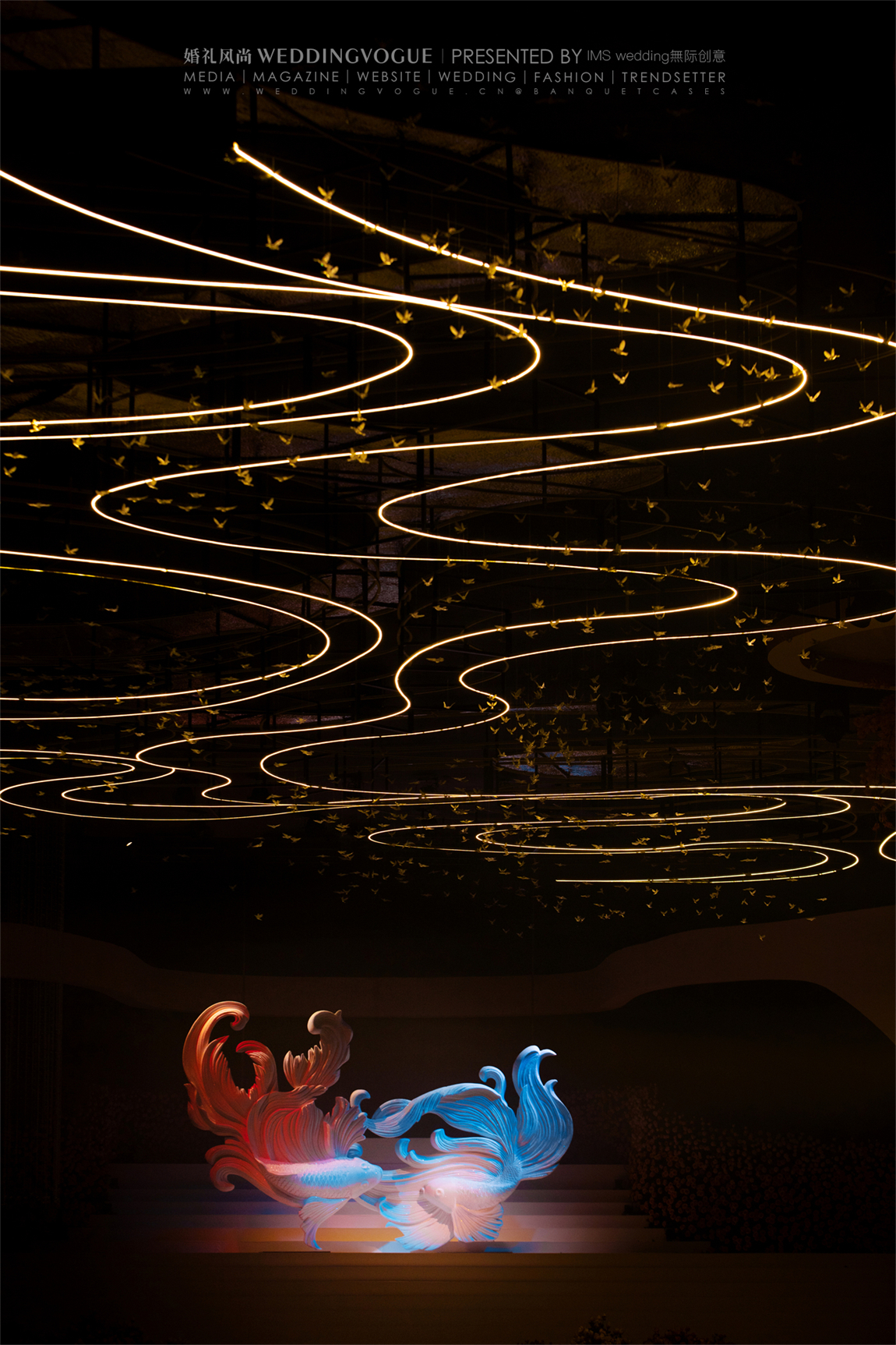 整个宴会厅的顶部设计呼应迎宾区的曲水流觞布局,用灯光来呈现出流淌的河流。