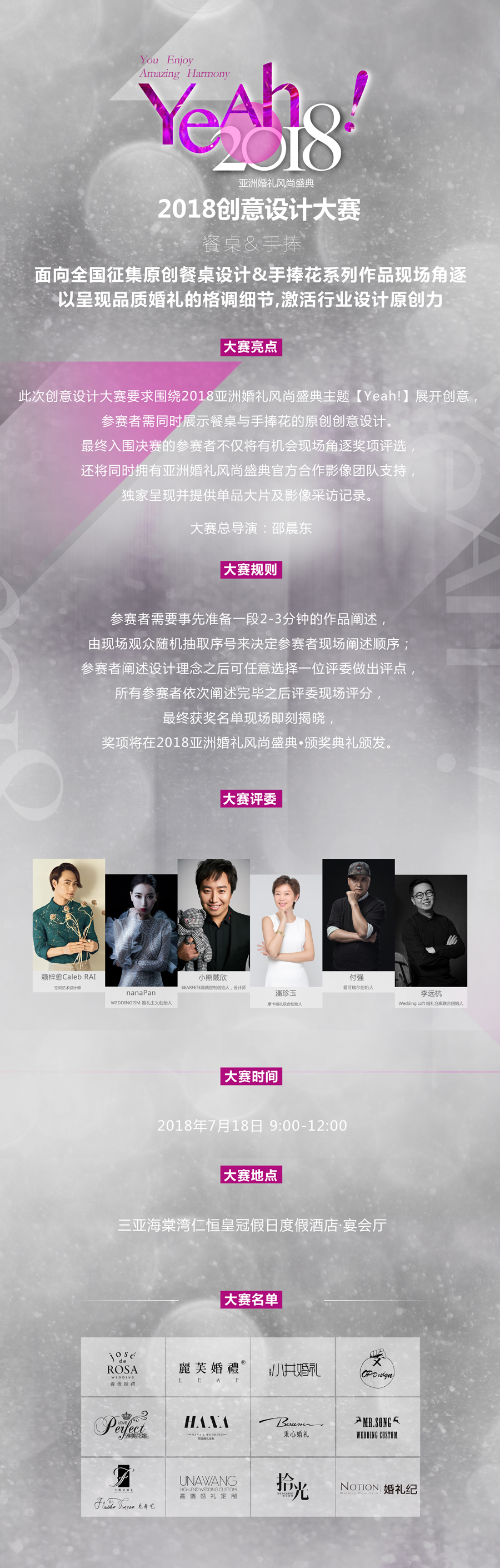 2018创意设计大赛作为本次亚洲婚礼风尚盛典的新增内容环节,我们面向全国征集了原创餐桌&手捧系列设计作品,并通过严格筛选,给到12名参赛者进入决赛的机会。