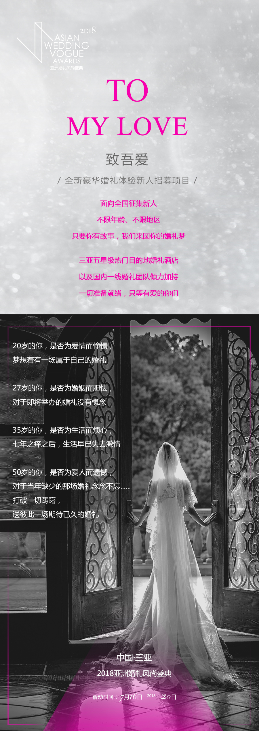 2018亚洲婚礼风尚盛典全新启动《致吾爱》——全新豪华婚礼体验新人招募项目,我们不限年龄,不限地区,不限性别,面向全国甄选出有故事的新人们,为他们准备了一场盛大的婚礼体验。