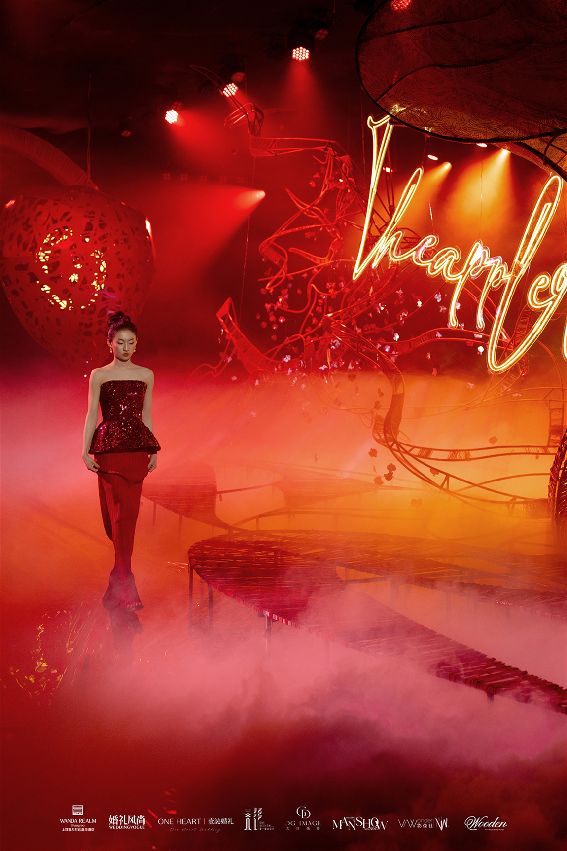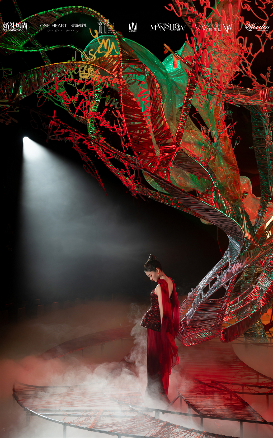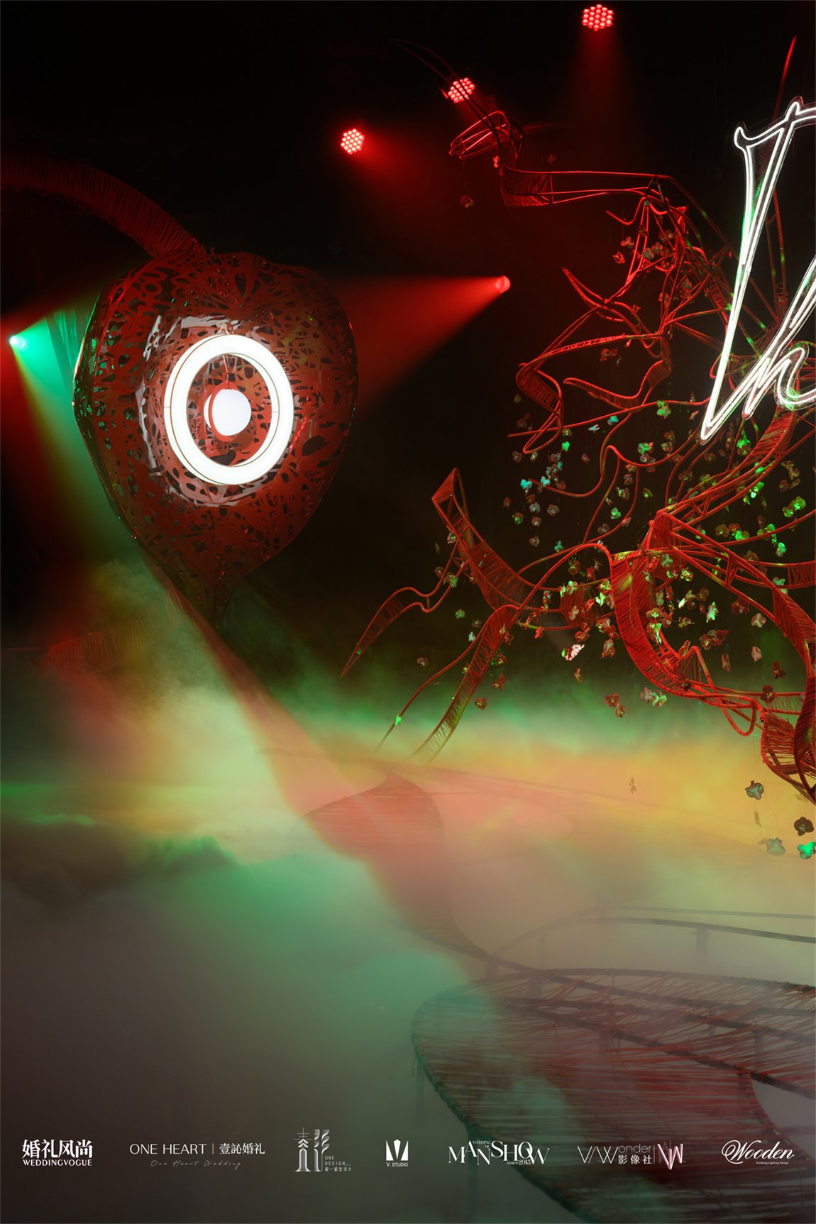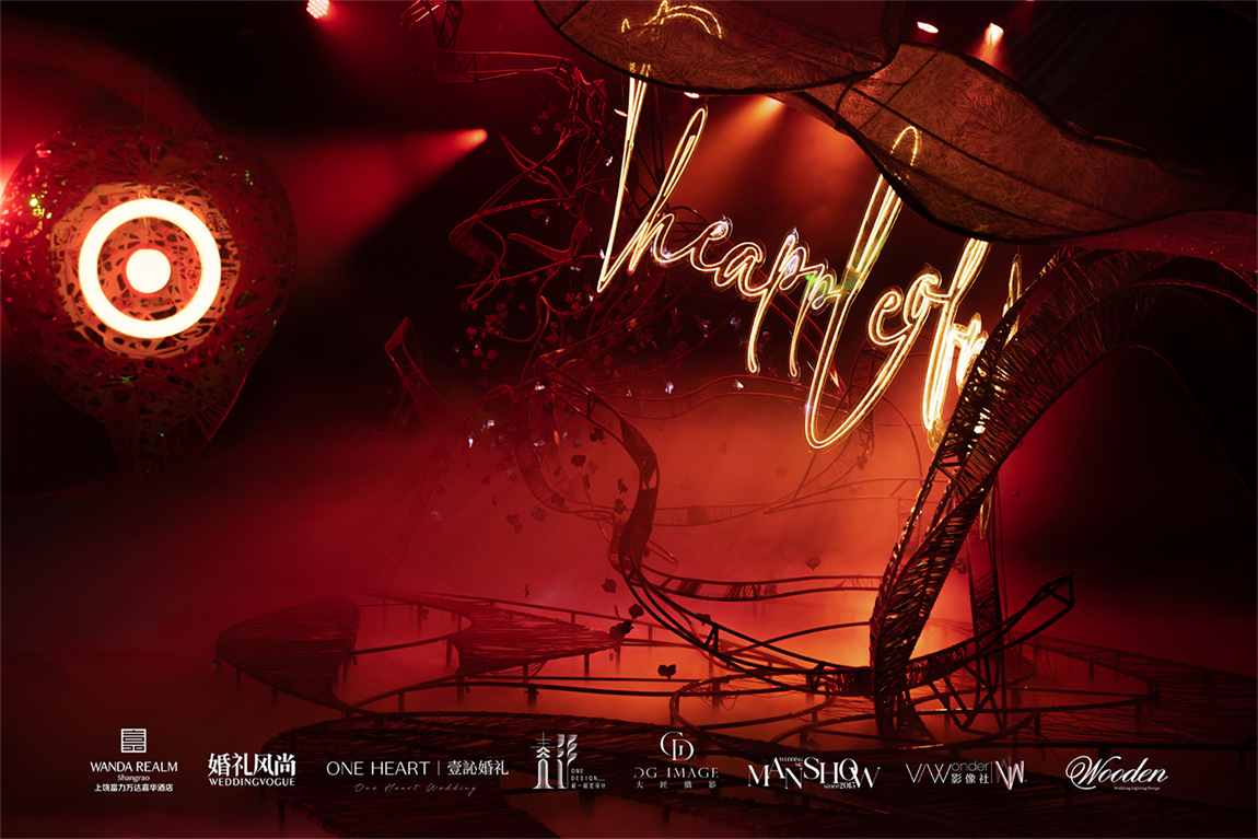整个秀场以镂空苹果核雕塑为舞台中心,内嵌LED屏播放新人故事,象征“爱的核心生生不息”。