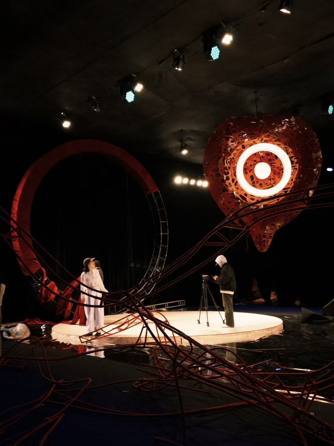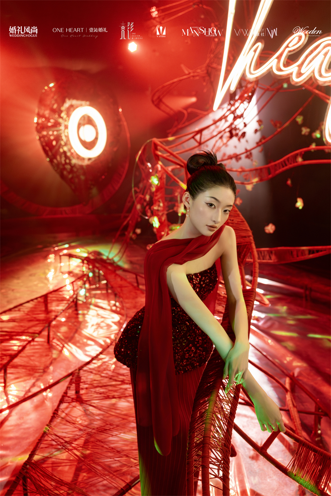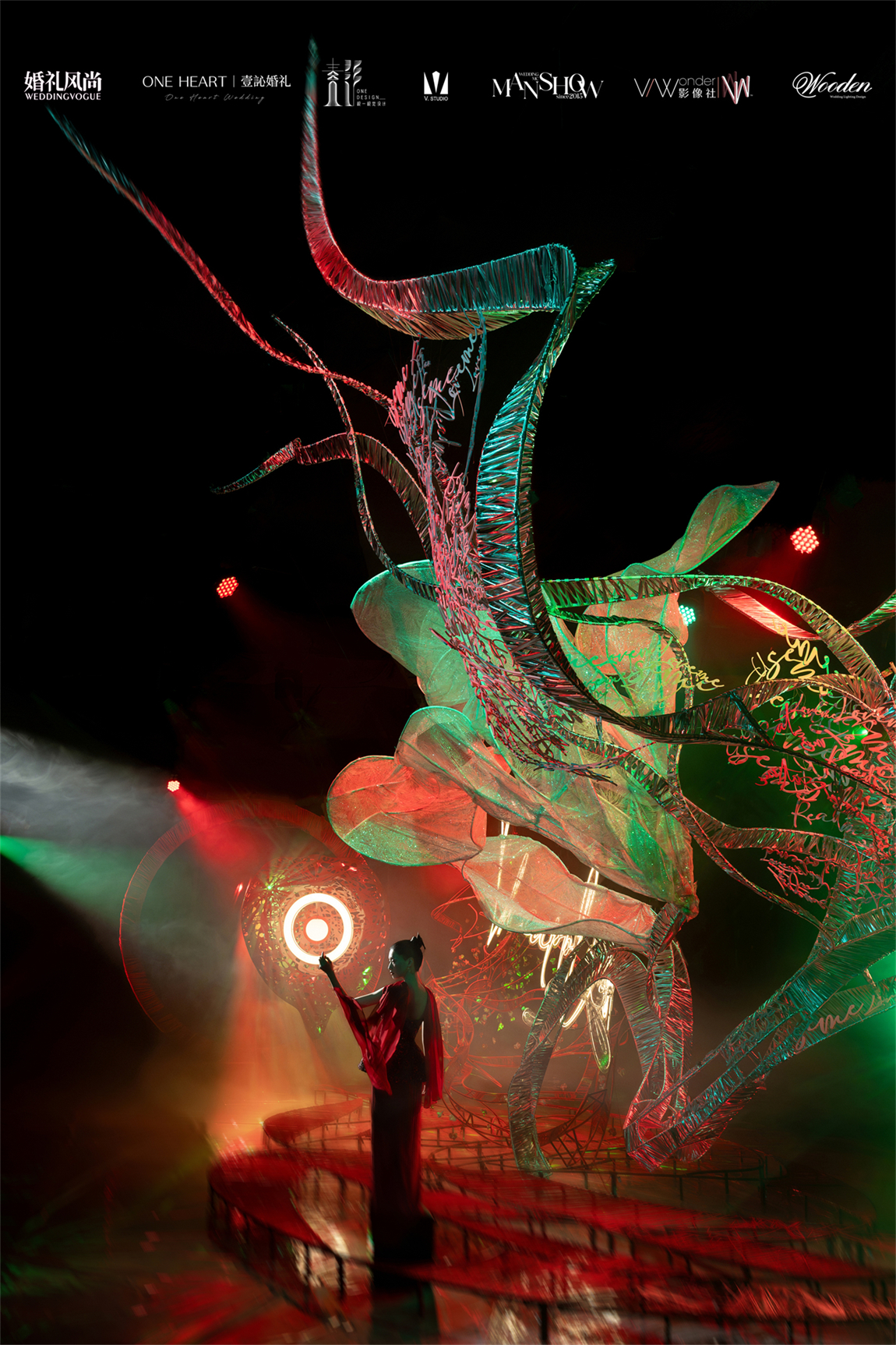 整个秀场以镂空苹果核雕塑为舞台中心,内嵌LED屏播放新人故事,象征“爱的核心生生不息”。