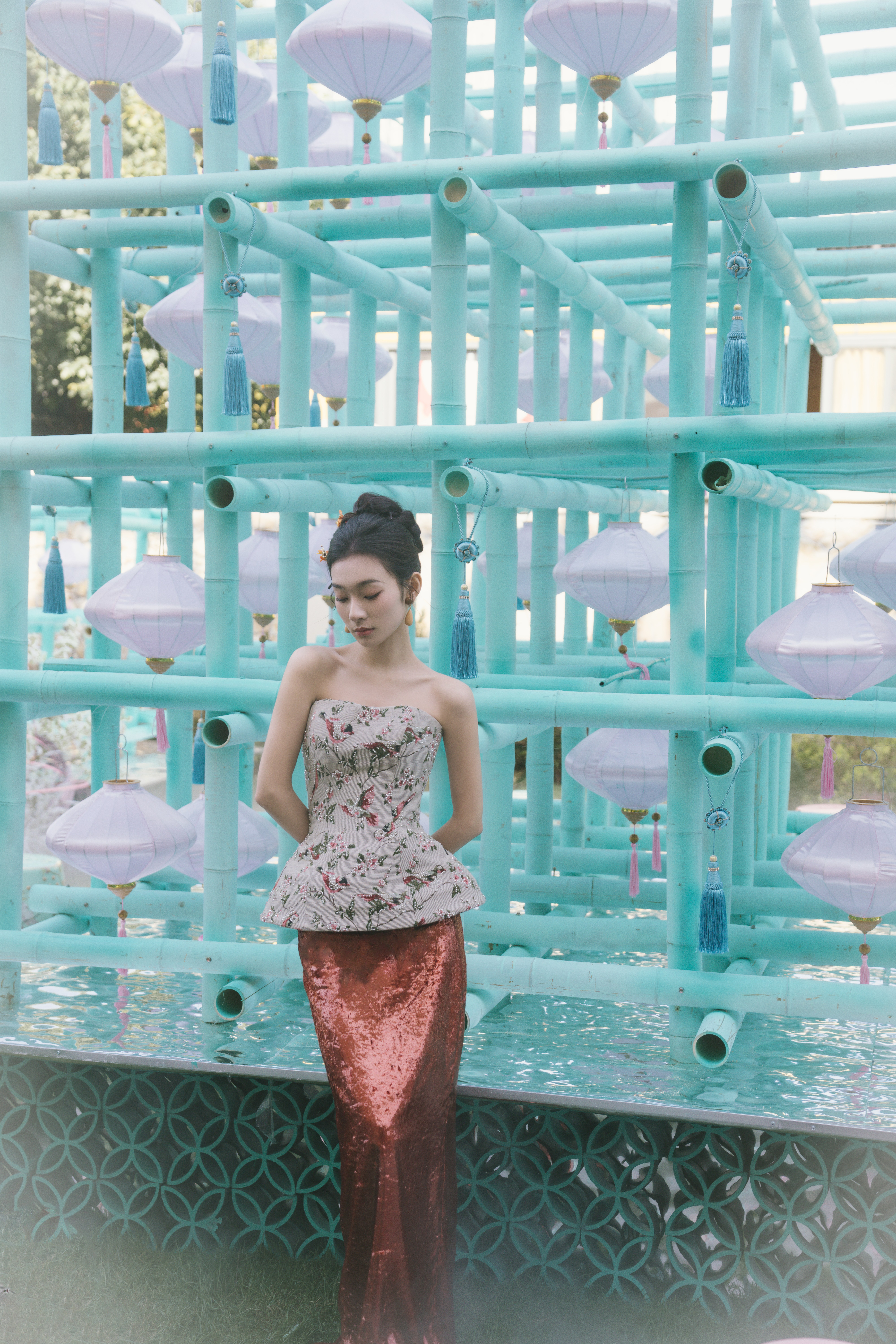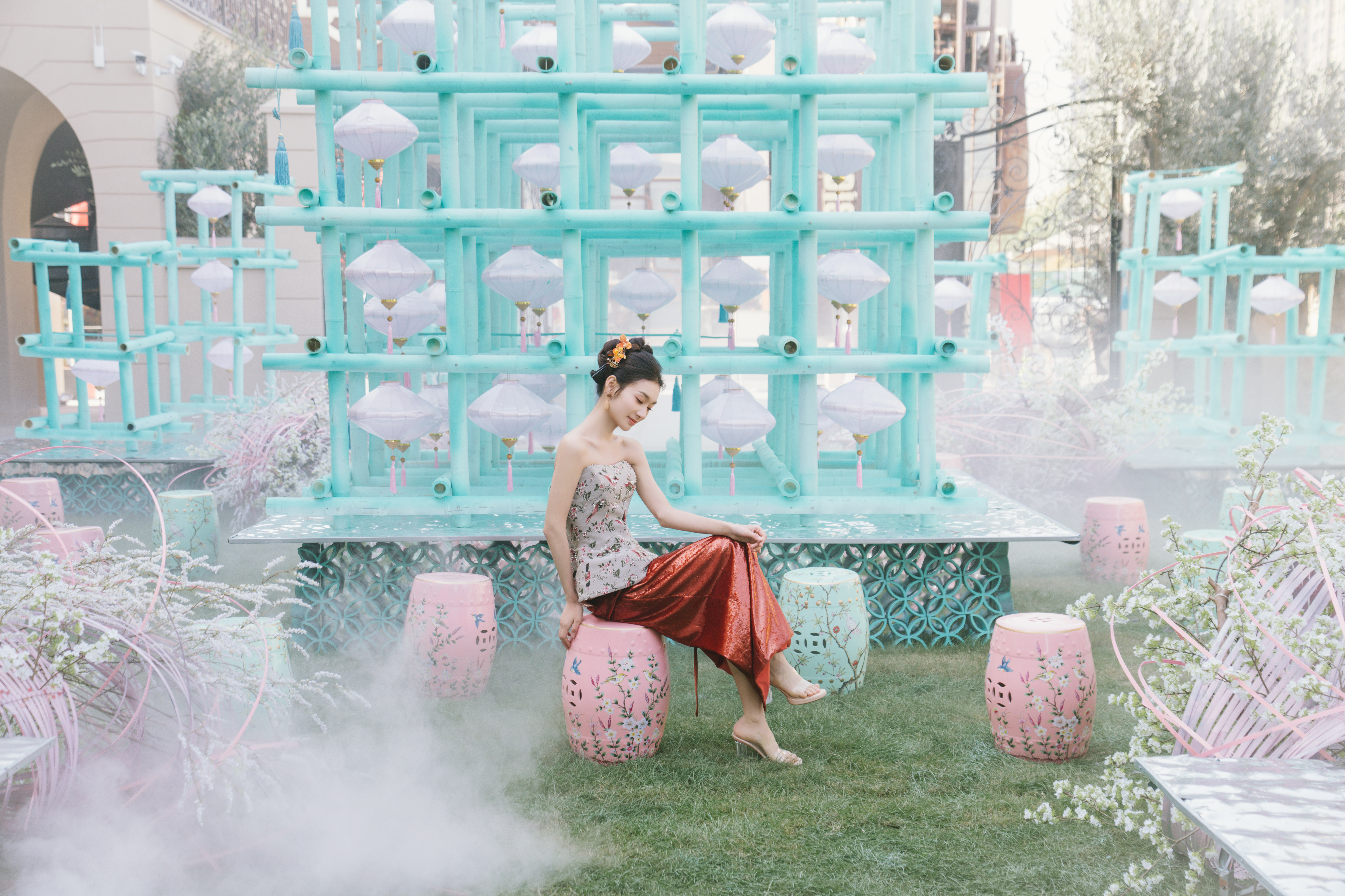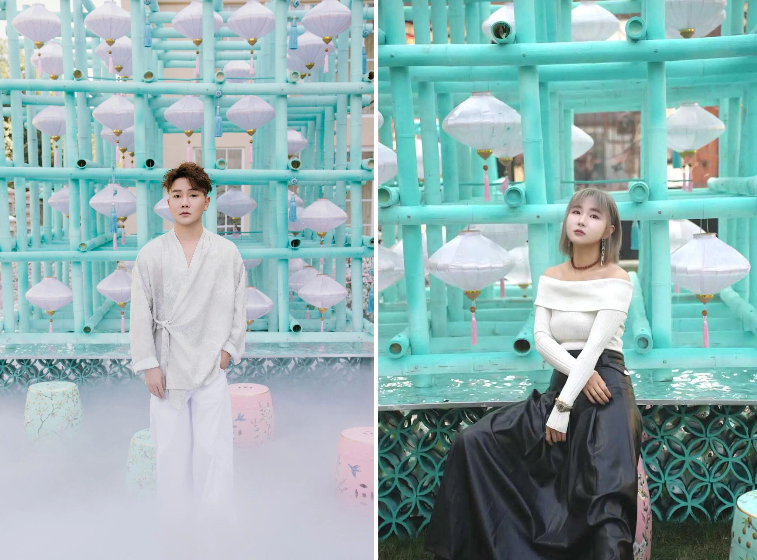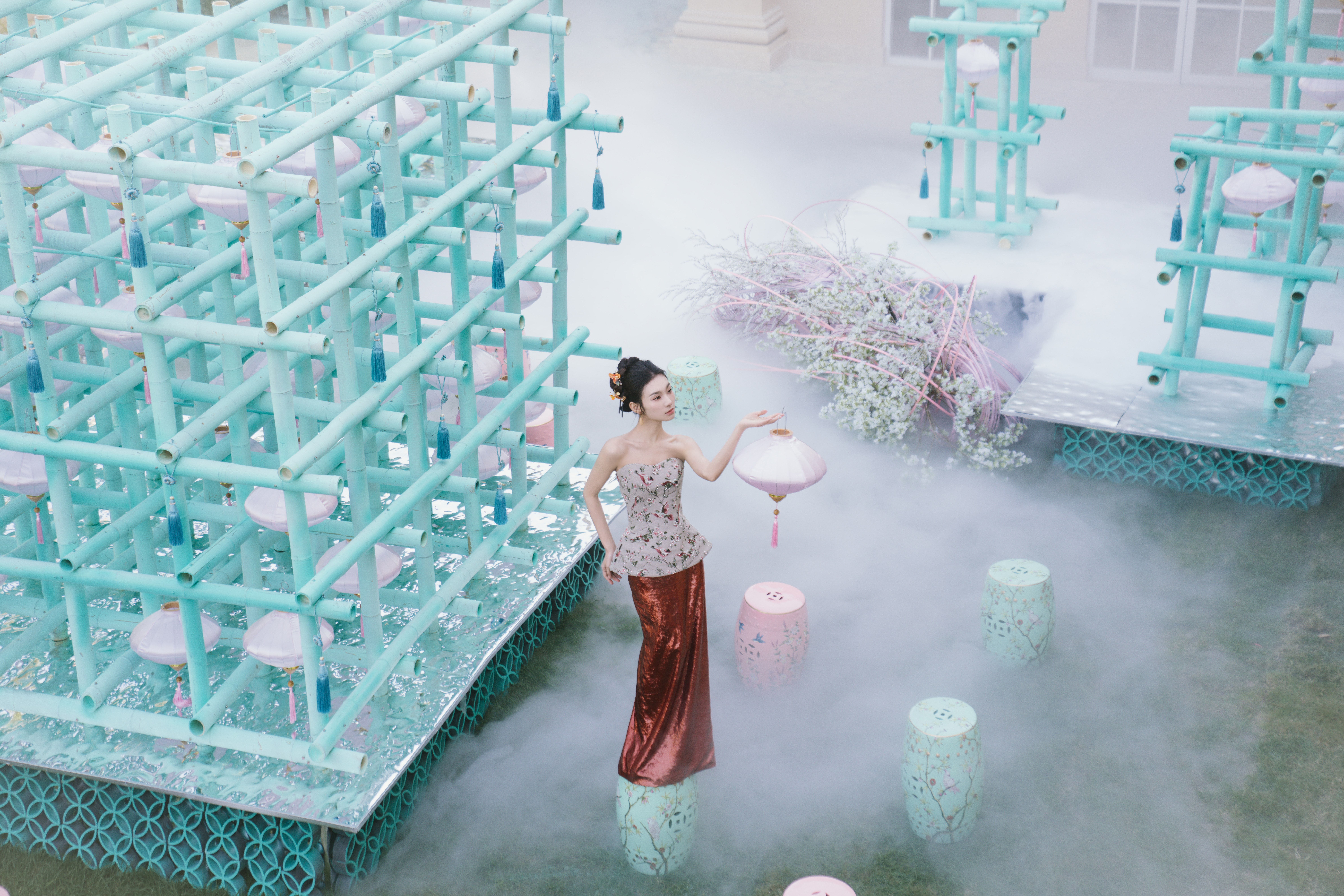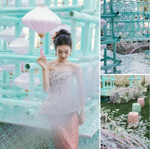 浅青色的竹架如山水画里的“留白”,以几何线条勾勒出中式建筑的空灵骨架,又似从江南园林的回廊中抽离的骨骼,将“疏可走马”的留白美学,以现代艺术形式重新演绎。