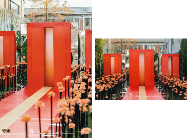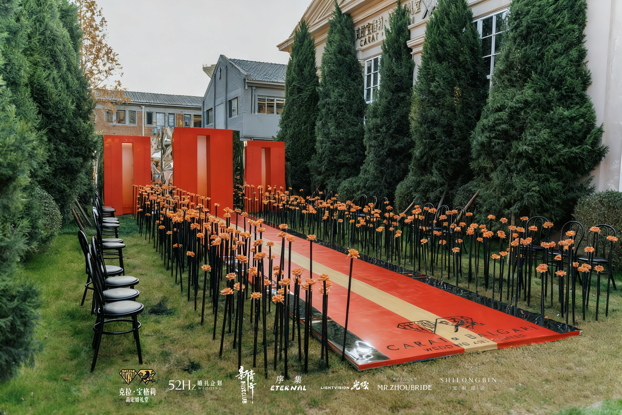 橙色是克拉宝格莉的品牌色,以“线性排列”方式贯穿场景,既柔化红色框架的硬朗感,又通过暖色调呼应红毯的热烈,瞬间将婚礼的高级感提升好几个level!