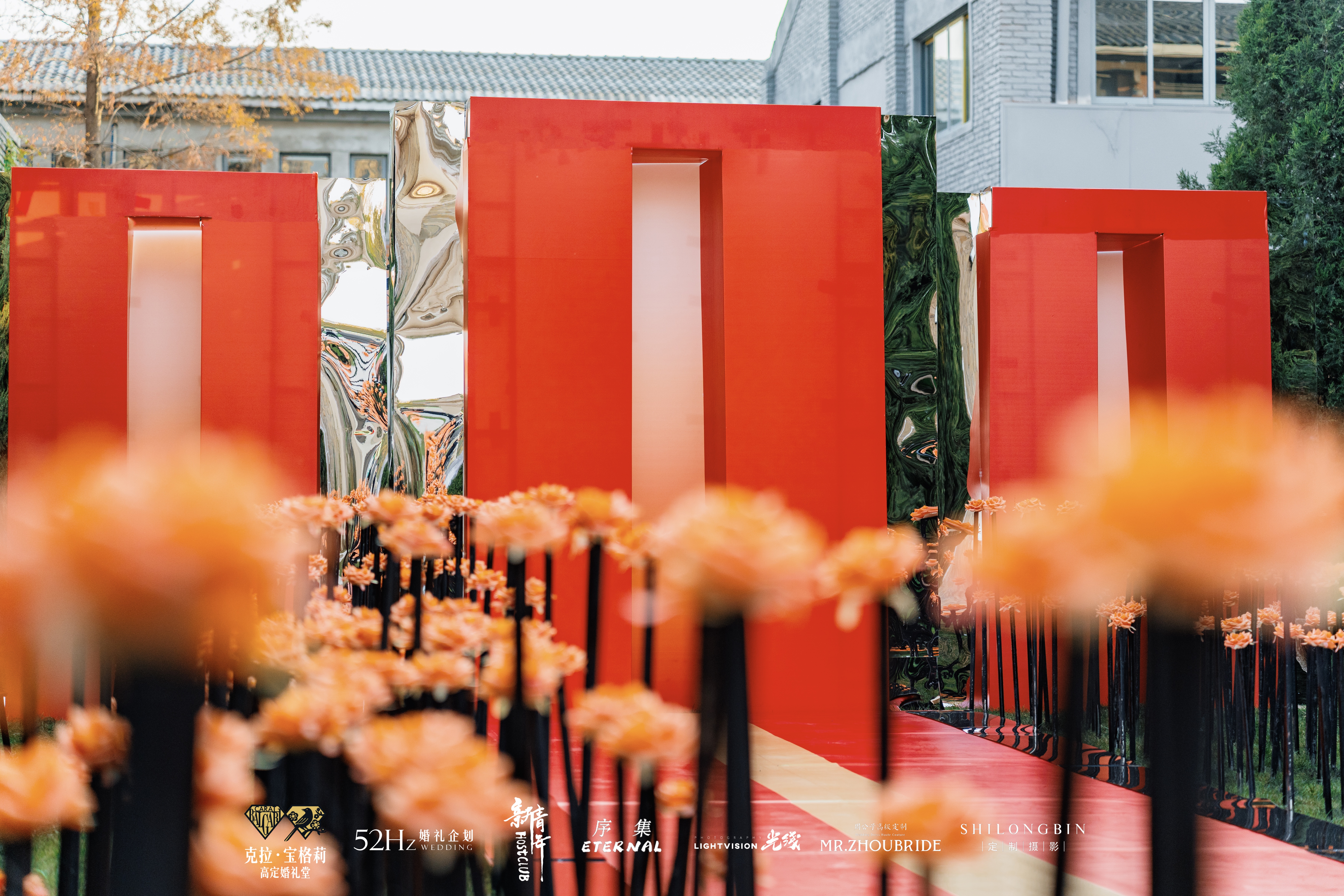 将高大的红色几何结构打造成视觉锚点,既像艺术装置的“空间切割器”,又似婚礼仪式的“仪式边界”,用强烈色彩强化仪式感,同时为空间注入现代艺术的先锋感。