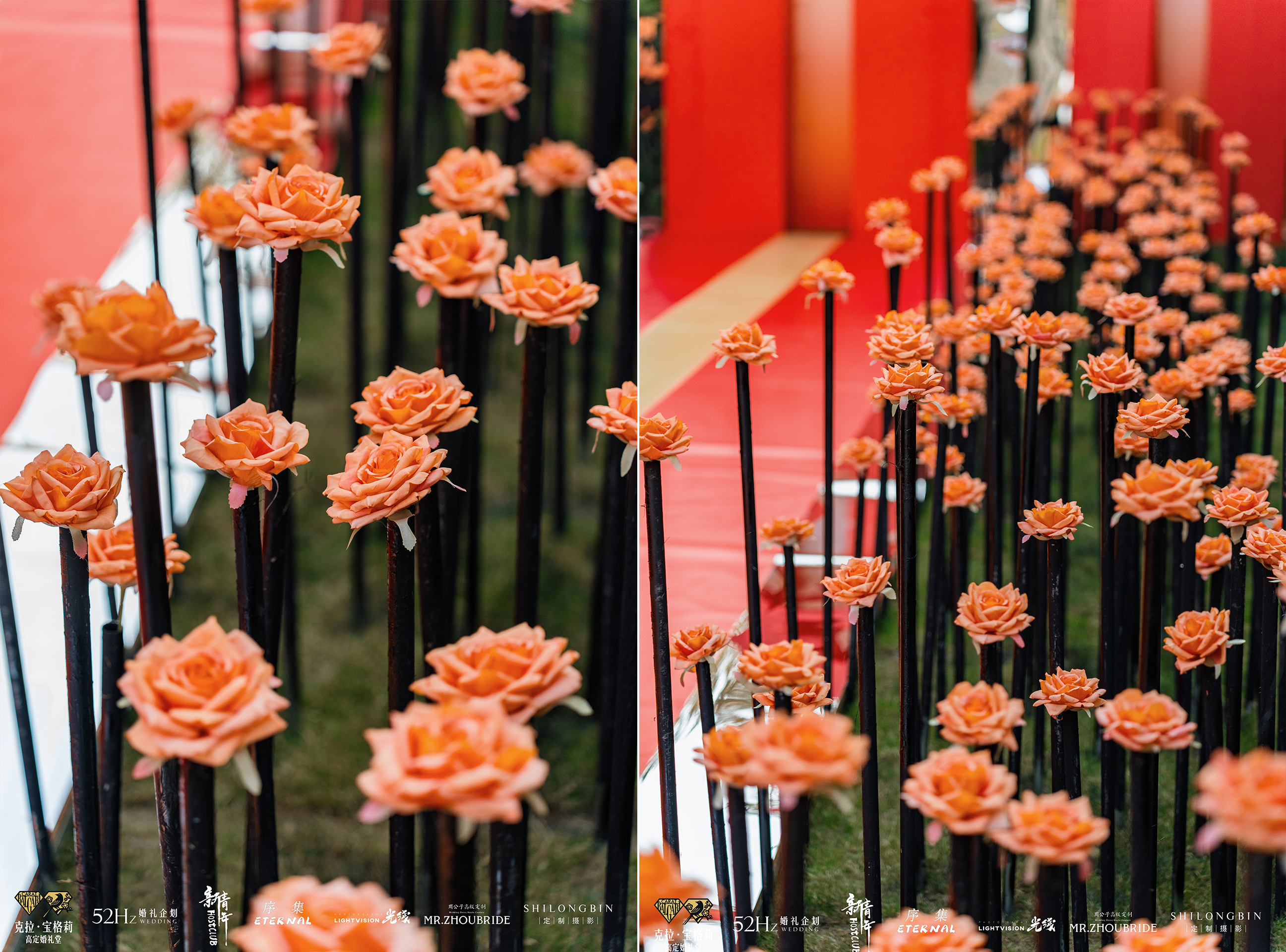 以红橙主色调为核心,融合现代艺术与自然氛围,打造出兼具仪式感与视觉张力的秀场风婚礼。