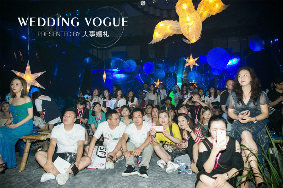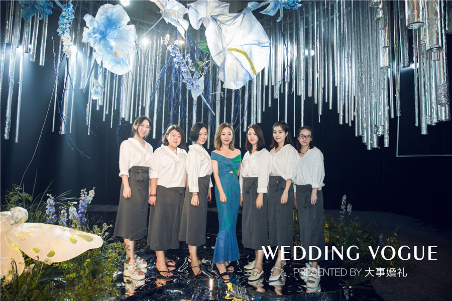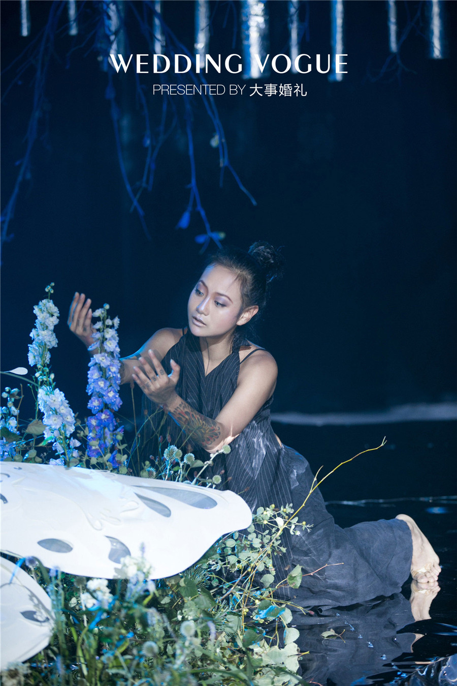 蓝靛,是贵州少数名族常用的天然染料,通过蜡染技术把布染成深蓝、中兰、群青、浅蓝、深灰、青、月白等颜色。而蓝色源自漫漫星空,也是人类已知最古老的颜色之一。蓝色更在传统的婚嫁习俗上代表忠诚与爱。于是将蓝色作为本场设计的主基调。