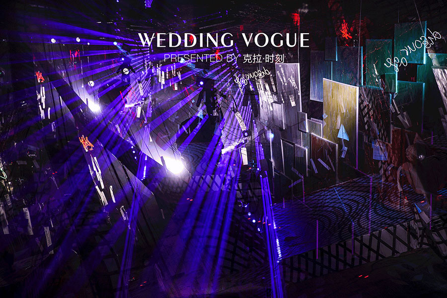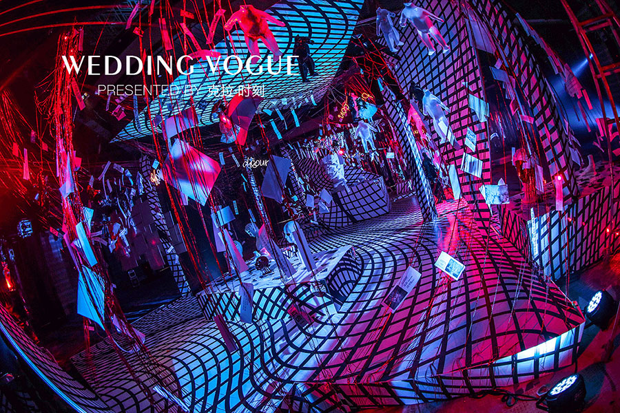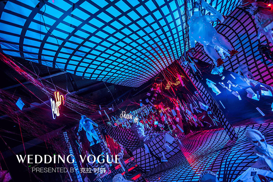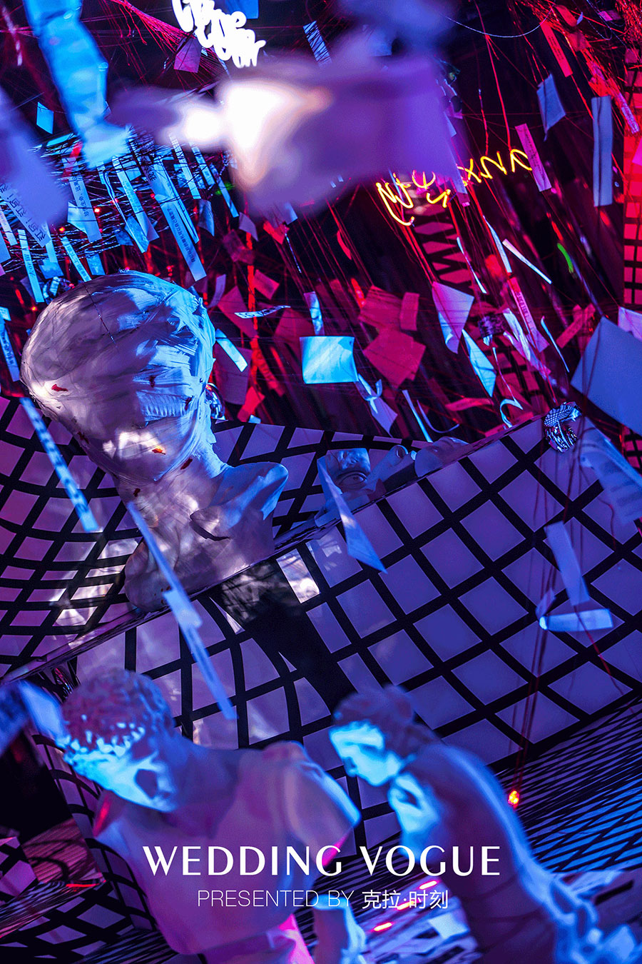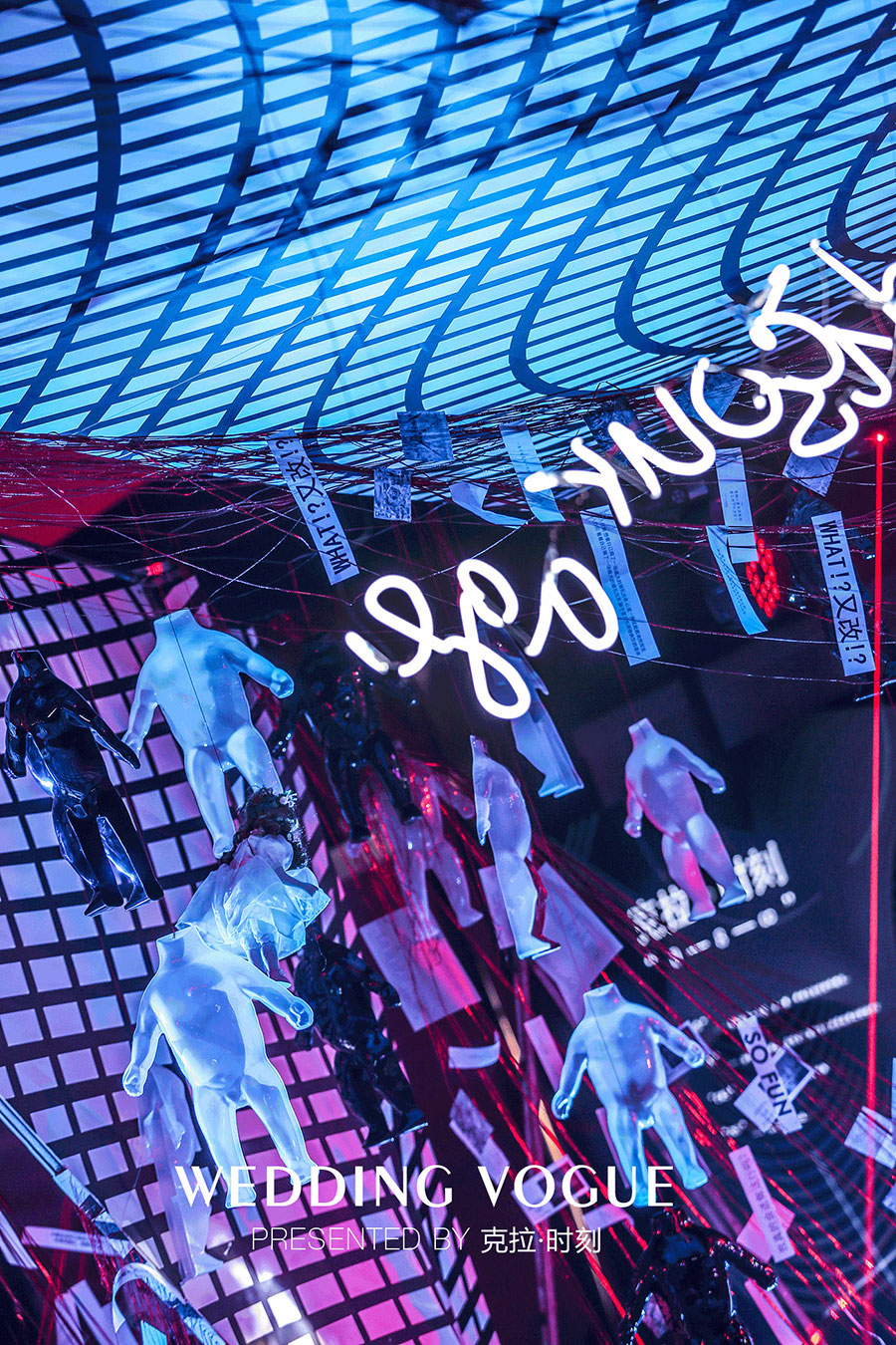 在这里设立了一个ccx的装置,中间用线条呈现空间感的立体结构,在黑暗中默默发光,表现出婚礼人经历过磨难后沉淀出的一种坚韧和被打磨过的自带光环的感觉。