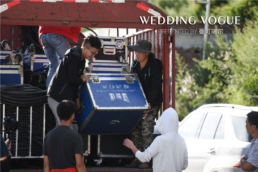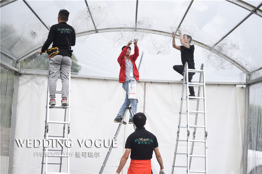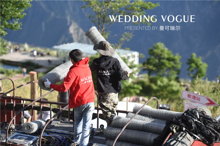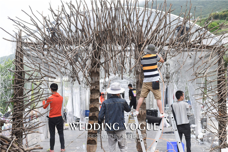 9周年的庆典晚宴,曼可瑞尔在浮云牧场的露天的坝子里搭建了一个透明的玻璃篷房,搭建的物料通过小货车一辆一辆运输上来,剩下的木头以及叶子等物料则是就地取材,直接运用。