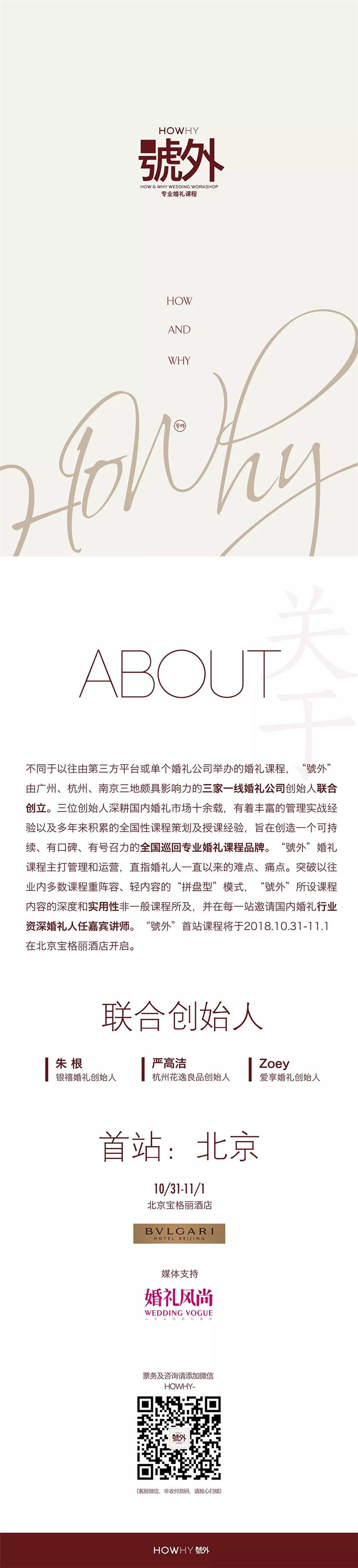 总是要有点特别的缘分,一路走来,才会成为一体。南京、广州、杭州,看似三个完全不相关的城市,却因为婚礼这个特殊的缘分“集结”成为了全国巡回专业婚礼课程品牌【號外】—“HOW”&“WHY”,明白为什么,并知道怎样做,才能不负自己,也不负岁月。