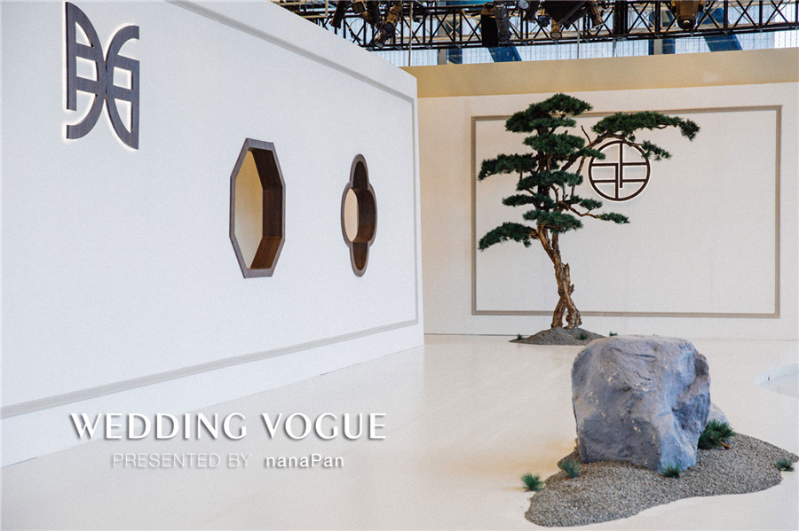 在场景设计上,将月白的大秀场景中融合进中国传统建筑元素,一松一石、一窗一景,丝绸如行云流水般婉转,每件礼服都在秀场上呈现出了绝美的东方气韵。