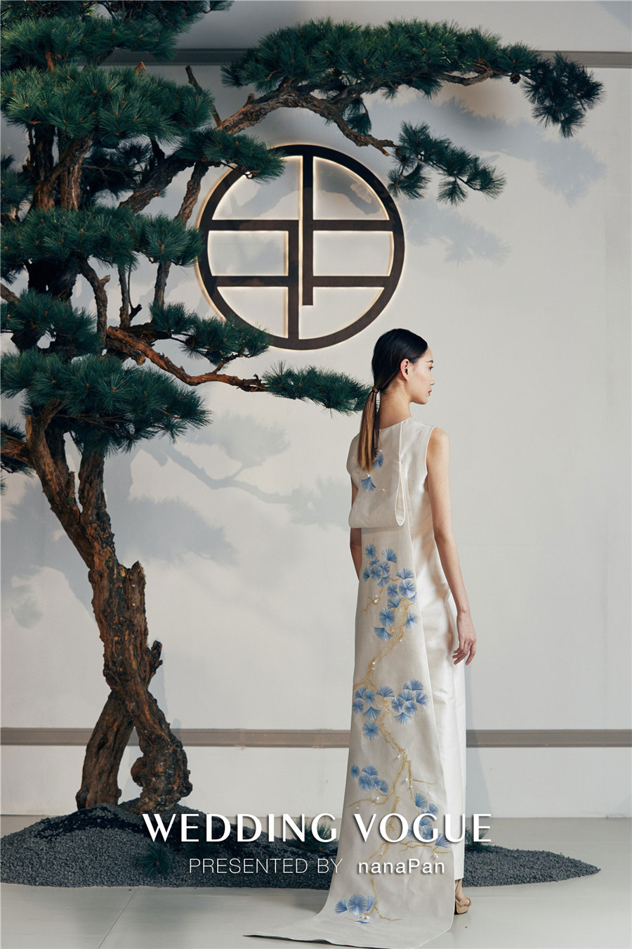 月白中式嫁衣此次2019春夏新中式系列的灵感来源于东方绘画艺术素材:在崇山峻岭、千年松、柏、山峦叠翠、云雾飘渺,松树的坚韧与云雾的柔和中呈现刚柔并济的状态。将中国传统窗棂文化融入服装设计中,结构中加入腰封、马面裙、绳结等中国元素,在时尚与传统中找到合适的平衡点。