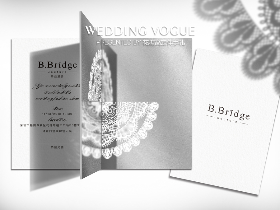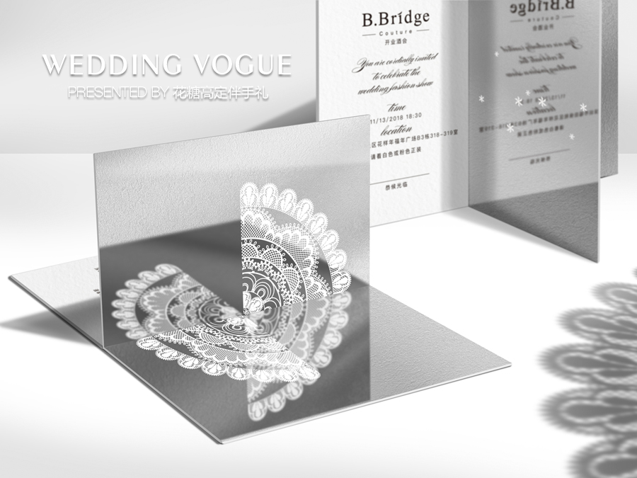 开业邀请函请柬设计采用立体式设计,镜面上的烫白蕾丝花纹互相投影。虚实之感,正如婚纱的朦胧与梦幻。