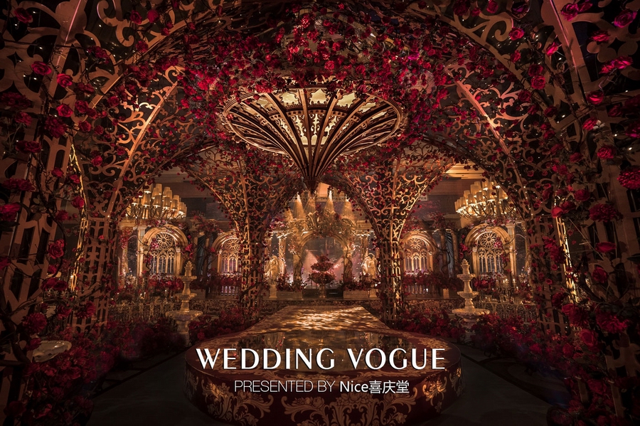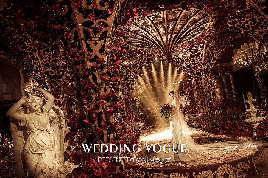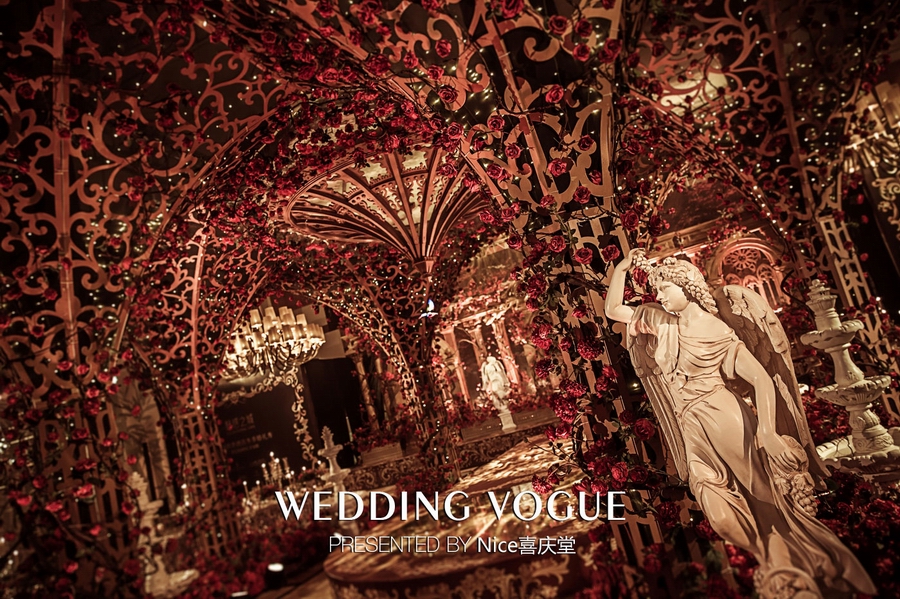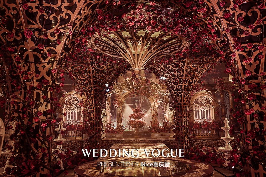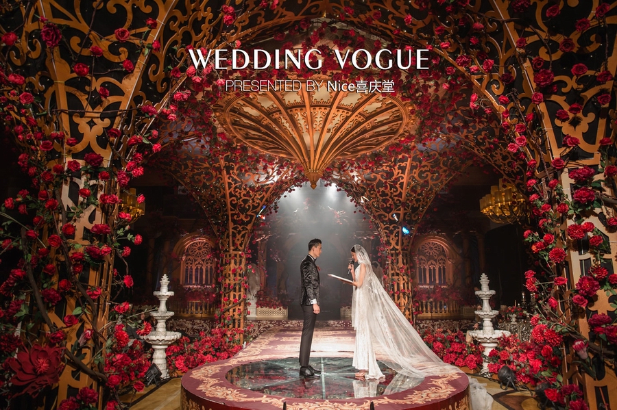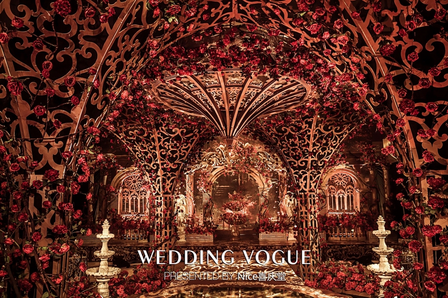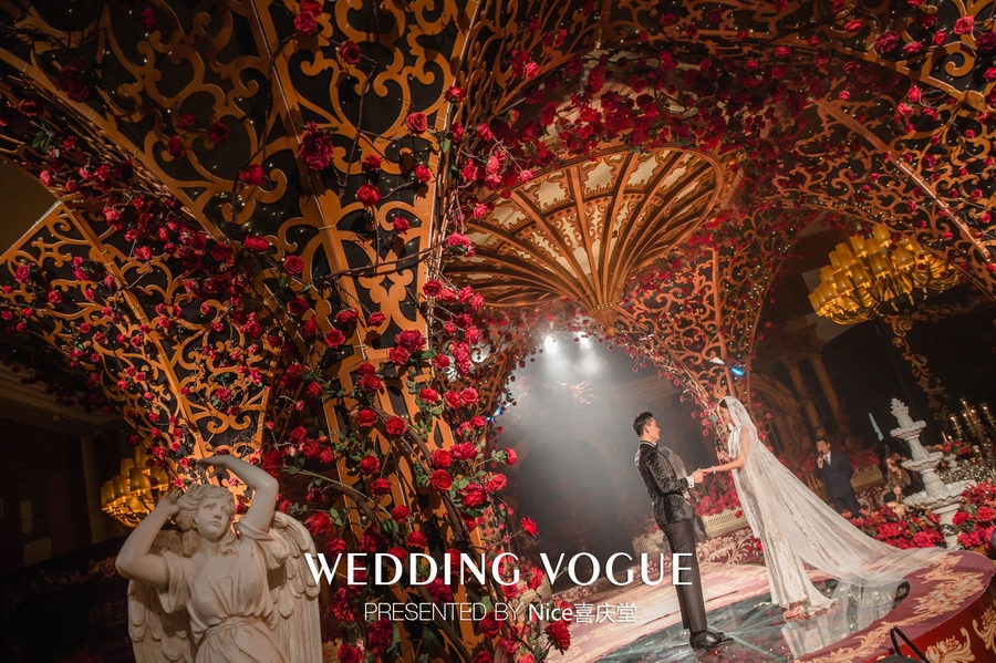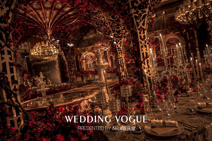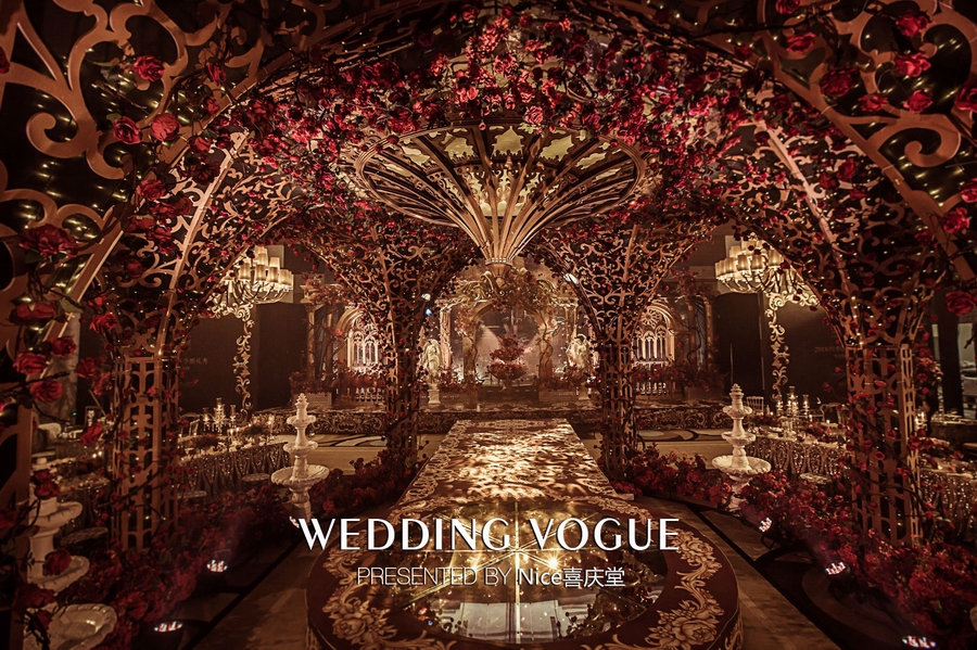 而在本次婚礼秀中,NICE喜庆堂在秀场内使用了近4万支勃艮第红玫瑰做装饰。随处可见的红色玫瑰与繁复精细的镂空雕花、华丽的金色穹顶相互搭配,以极致华丽风情,把现场打造成了一个神秘浪漫的玫瑰庄园。