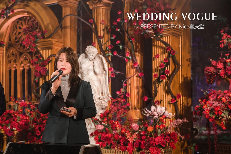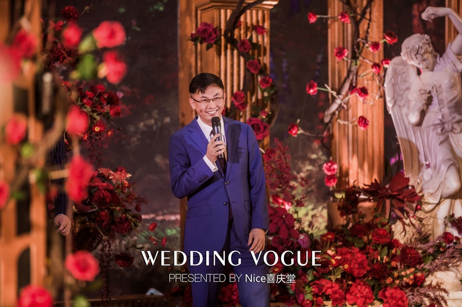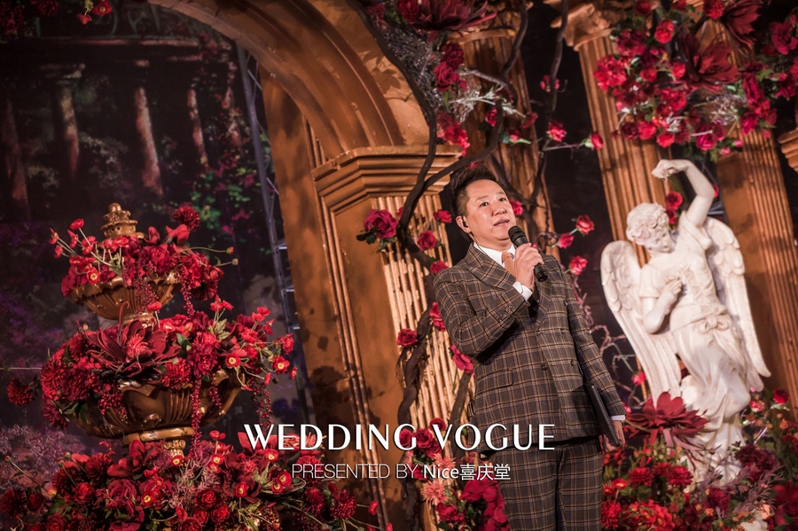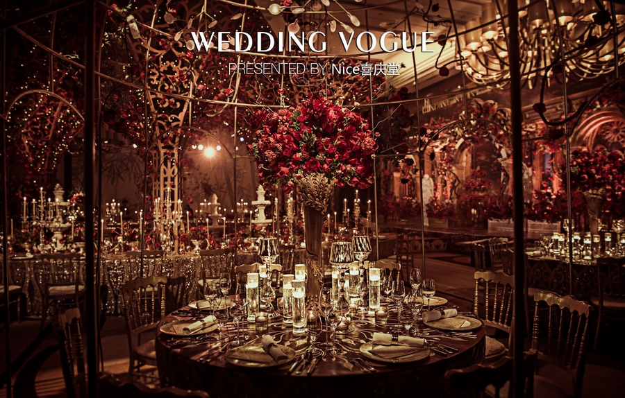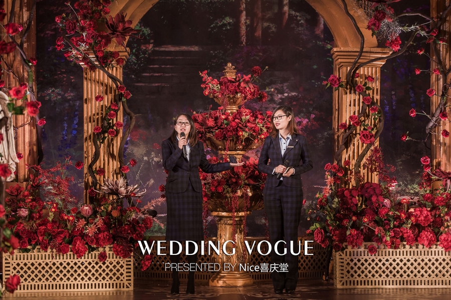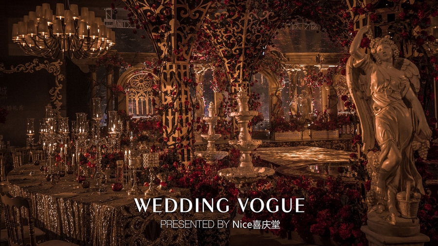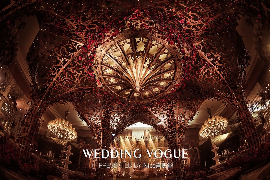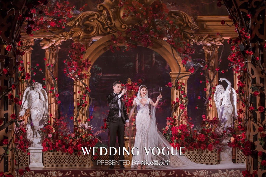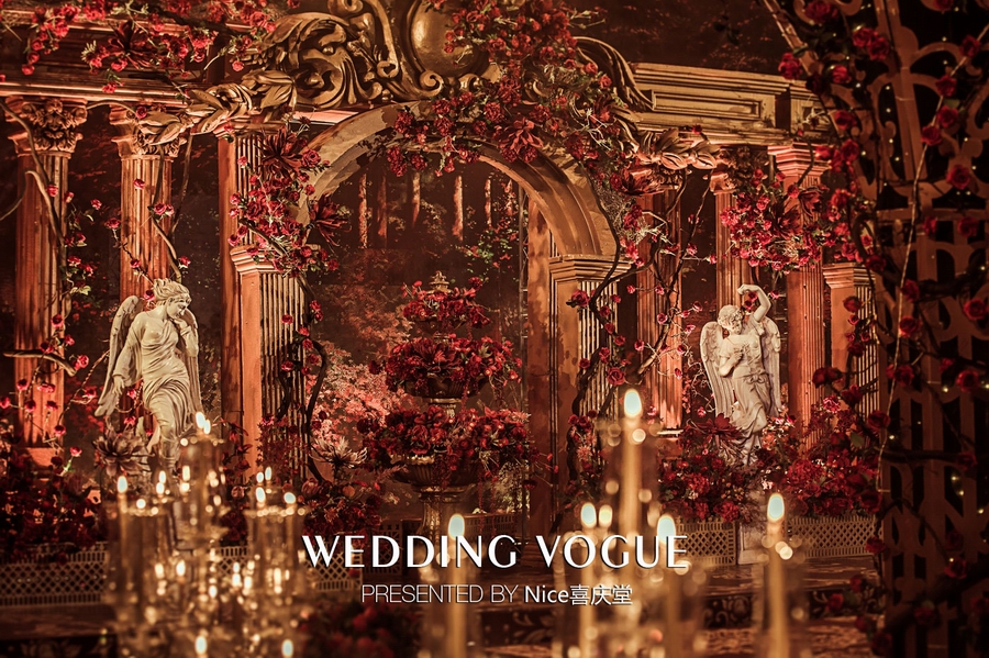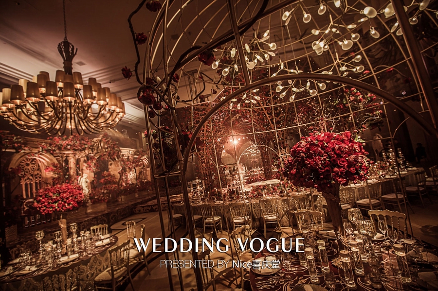 而在本次婚礼秀中,NICE喜庆堂在秀场内使用了近4万支勃艮第红玫瑰做装饰。随处可见的红色玫瑰与繁复精细的镂空雕花、华丽的金色穹顶相互搭配,以极致华丽风情,把现场打造成了一个神秘浪漫的玫瑰庄园。