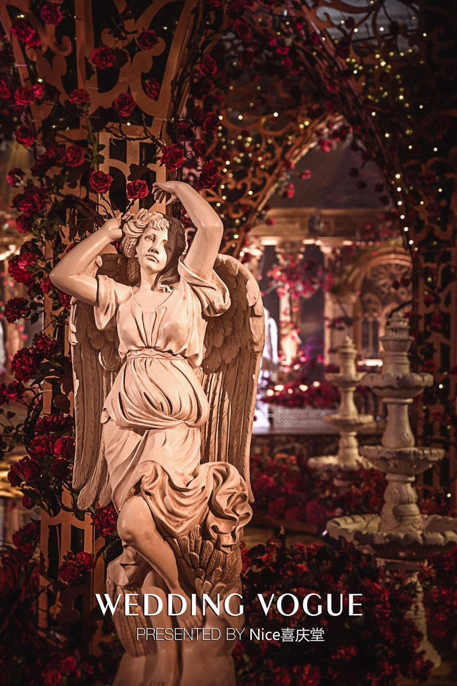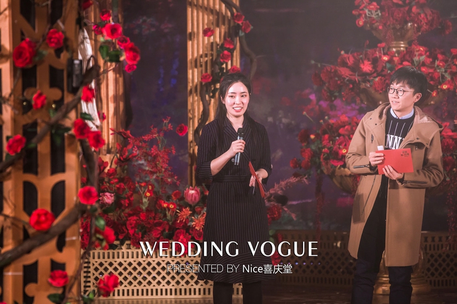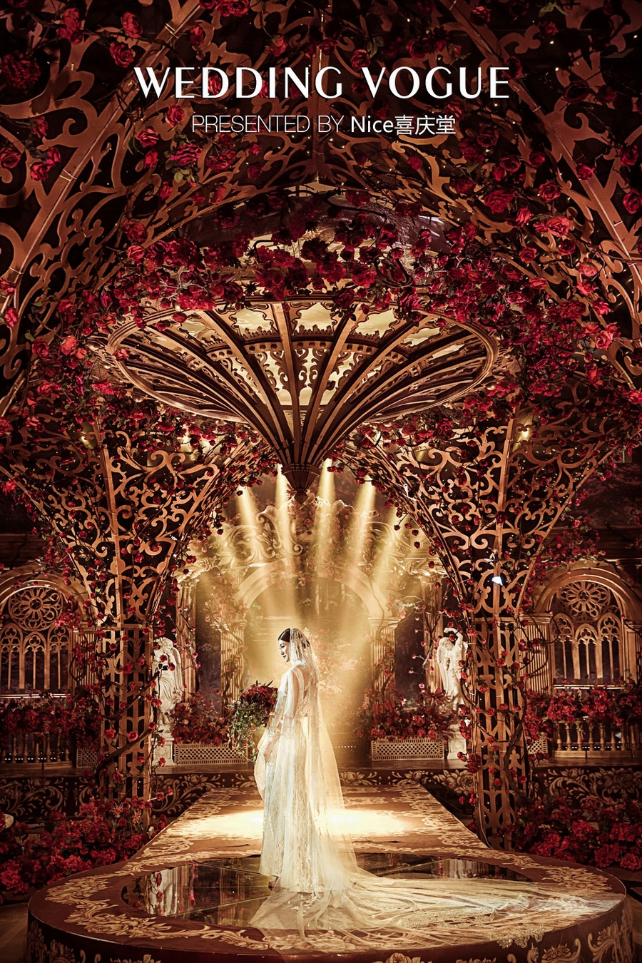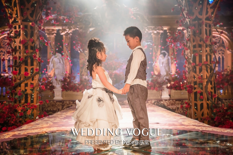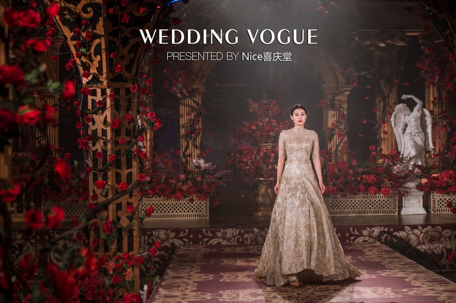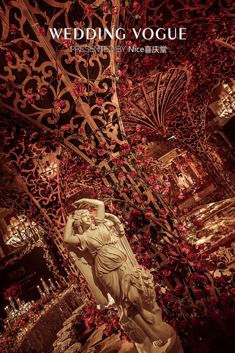 而在本次婚礼秀中,NICE喜庆堂在秀场内使用了近4万支勃艮第红玫瑰做装饰。随处可见的红色玫瑰与繁复精细的镂空雕花、华丽的金色穹顶相互搭配,以极致华丽风情,把现场打造成了一个神秘浪漫的玫瑰庄园。