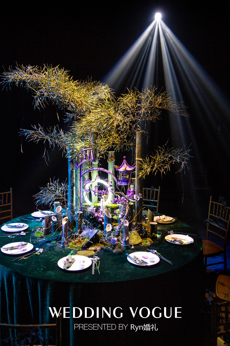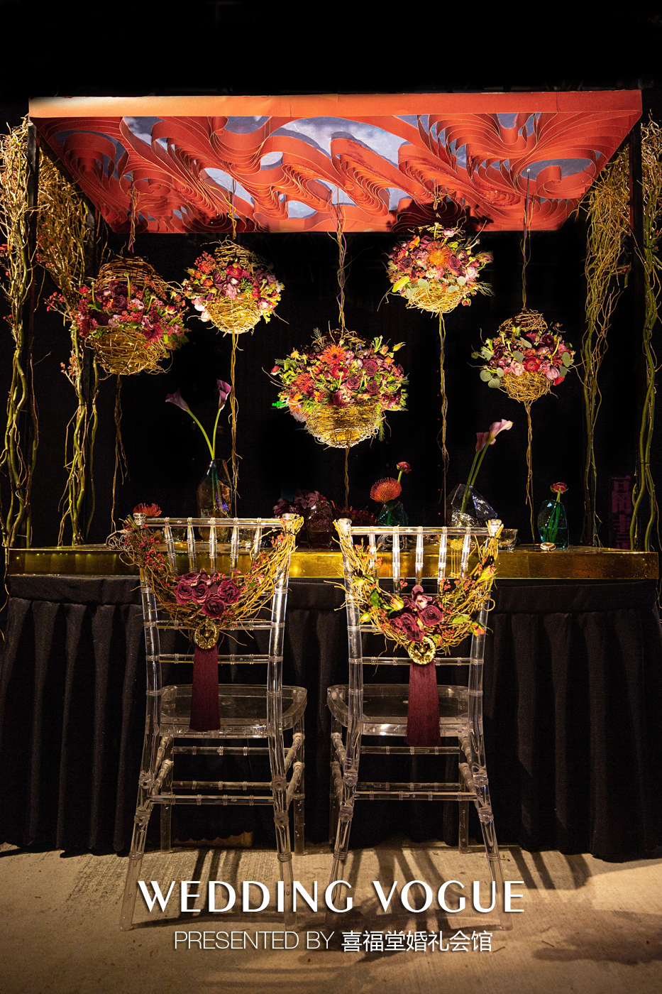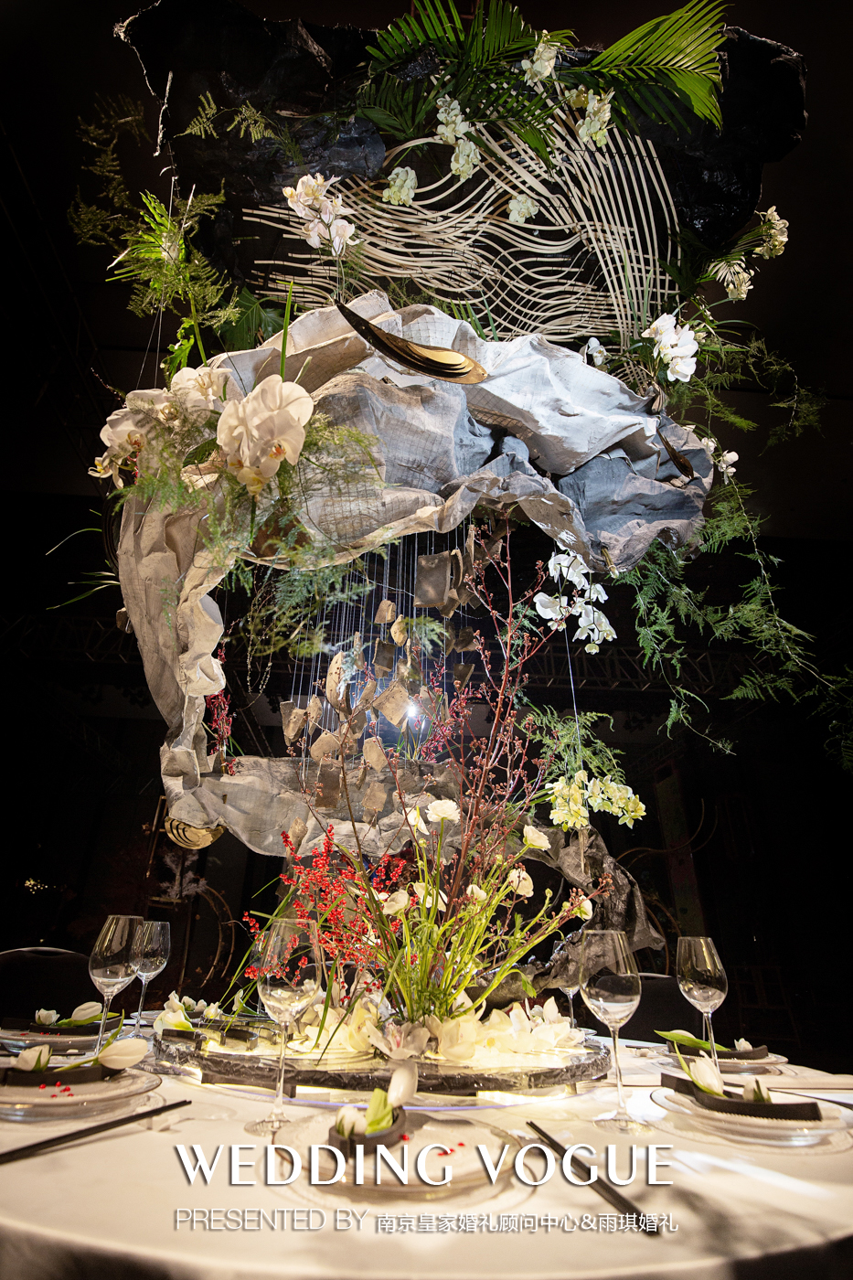 根据主题“囍”,在上下结构中间用花艺做延伸,因为双喜合并就代表着孕育着生命,在实用性方面也很好的避免了遮挡对桌用餐人的视线。“中国新娘”是孕育生命的载体。花包比喻成“脉冲”,是由两个半圆结合而成,与主题阴阳概念呼应。