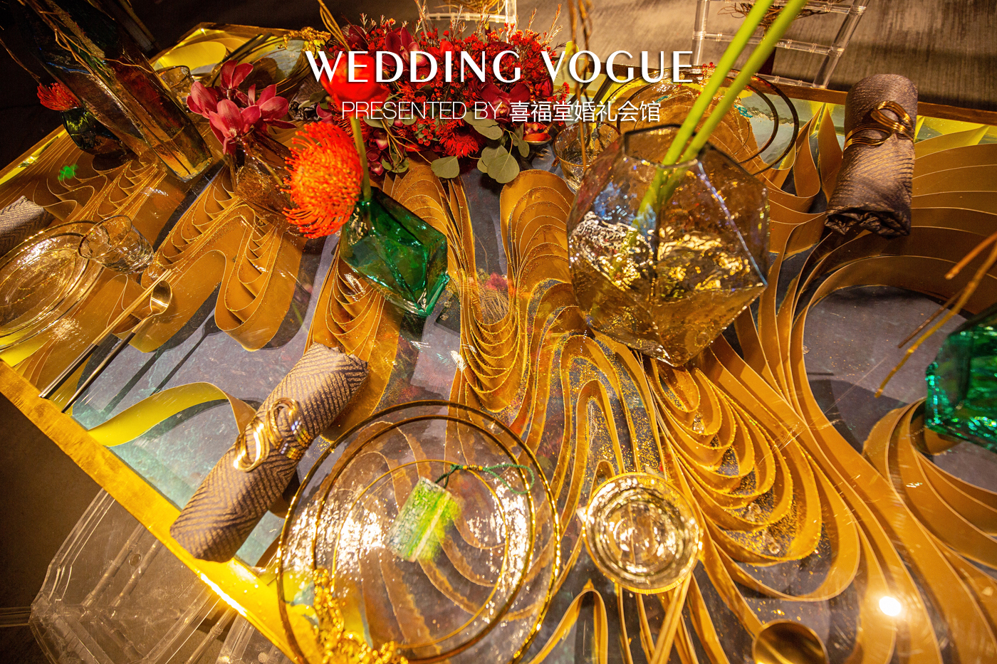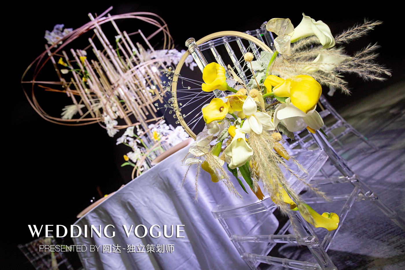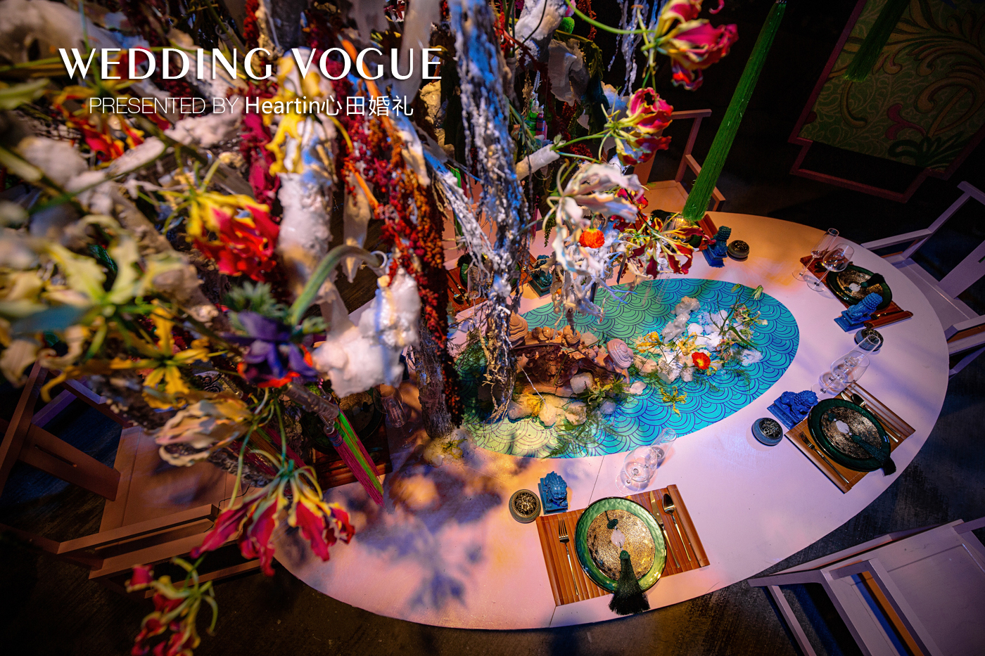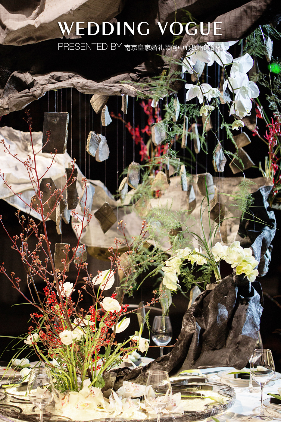 根据主题“囍”,在上下结构中间用花艺做延伸,因为双喜合并就代表着孕育着生命,在实用性方面也很好的避免了遮挡对桌用餐人的视线。“中国新娘”是孕育生命的载体。花包比喻成“脉冲”,是由两个半圆结合而成,与主题阴阳概念呼应。