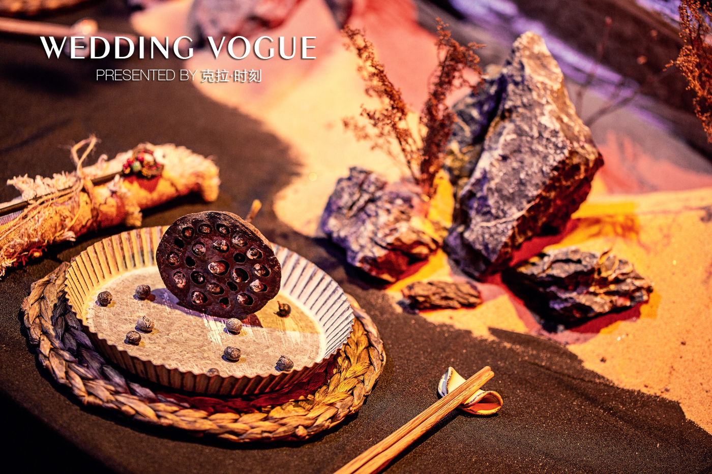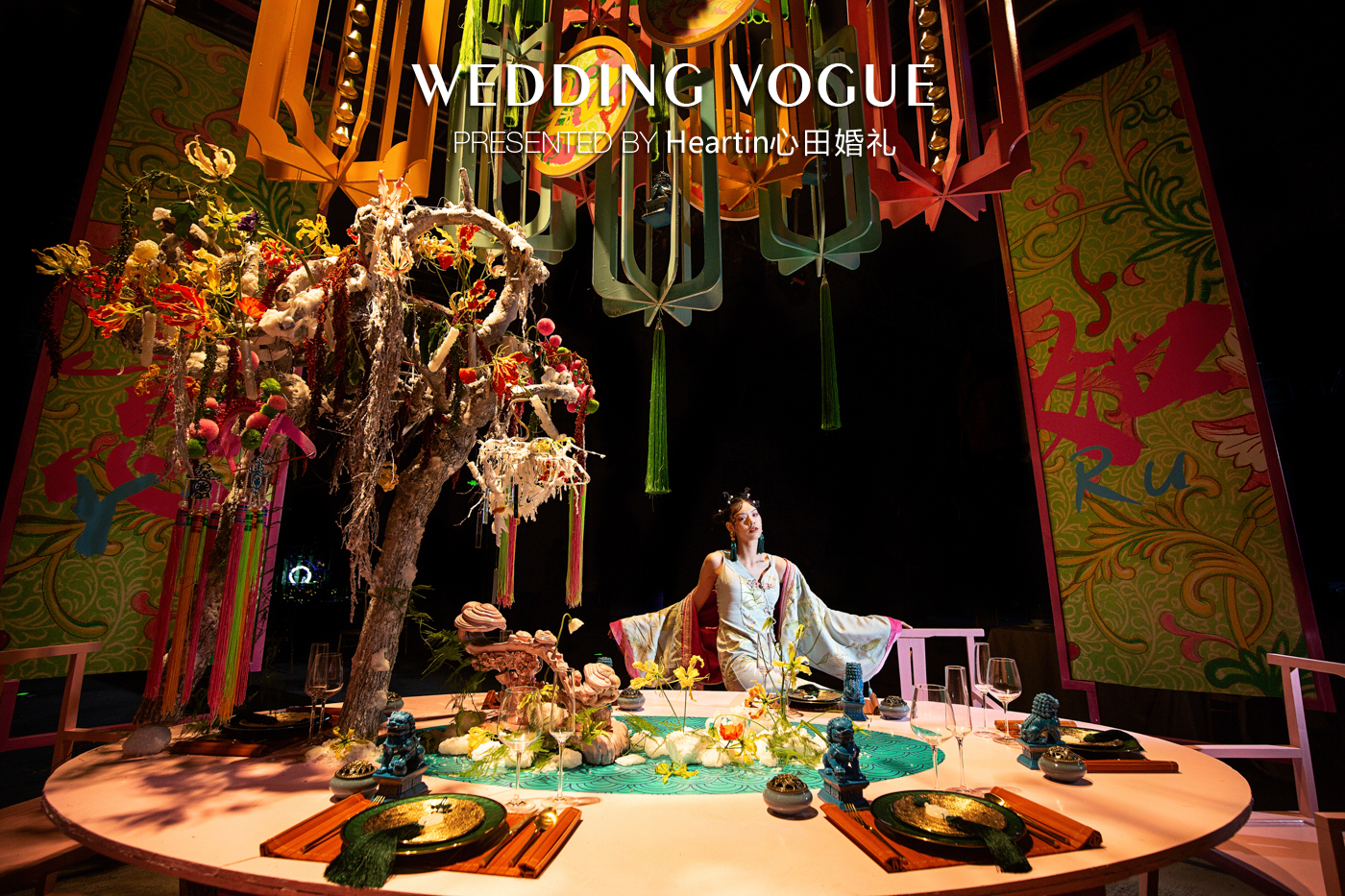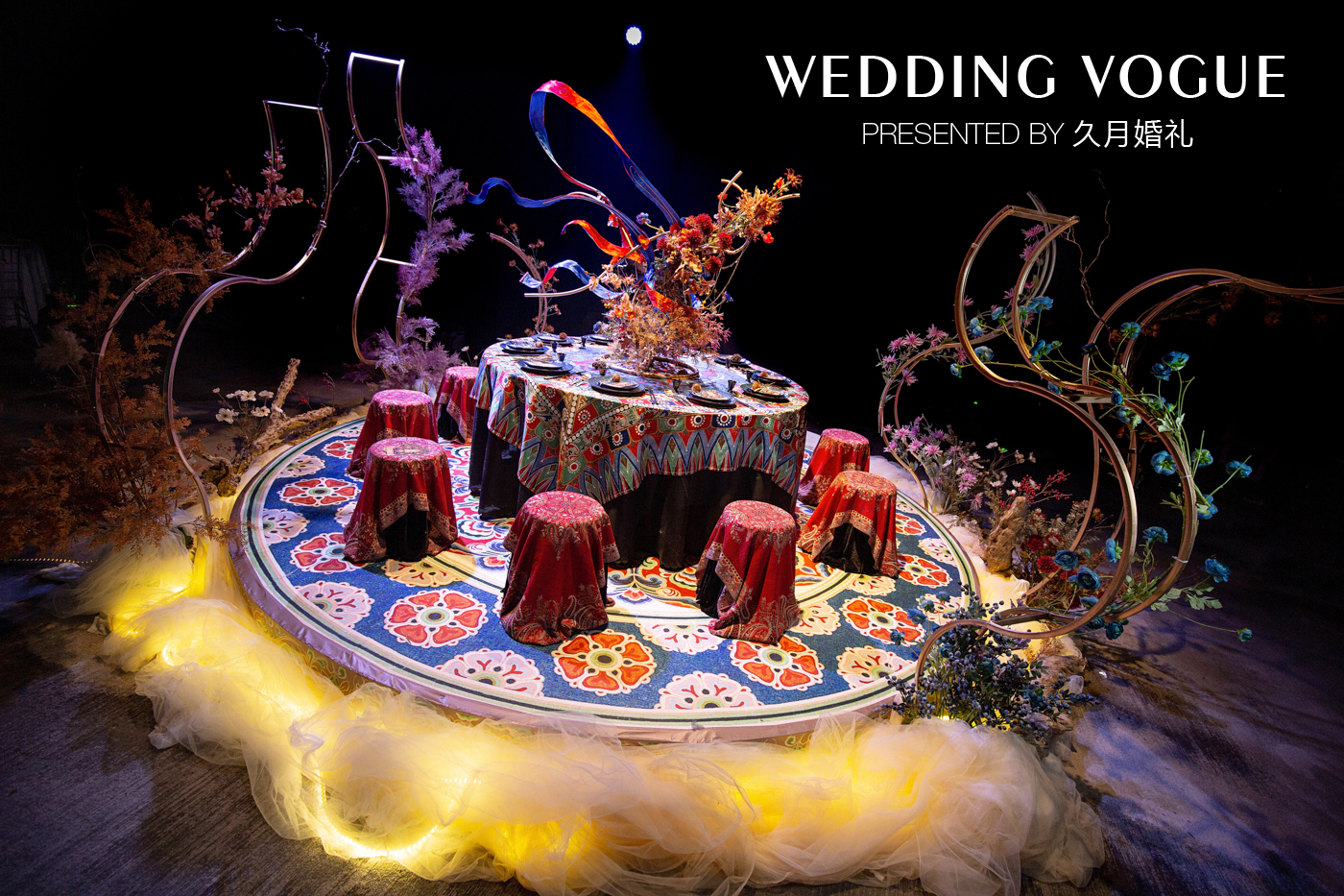 餐桌的整体设计旨在展现敦煌独特的西域文化与风情,设计师将敦煌的天神-飞天女带入诠释中国新娘之美。整个设计采用红、黄、蓝三种中国传统的代表彩色,来诠释西域的民族特色,细节上则通过铁艺的制作来展现飞天女的灵动柔美。