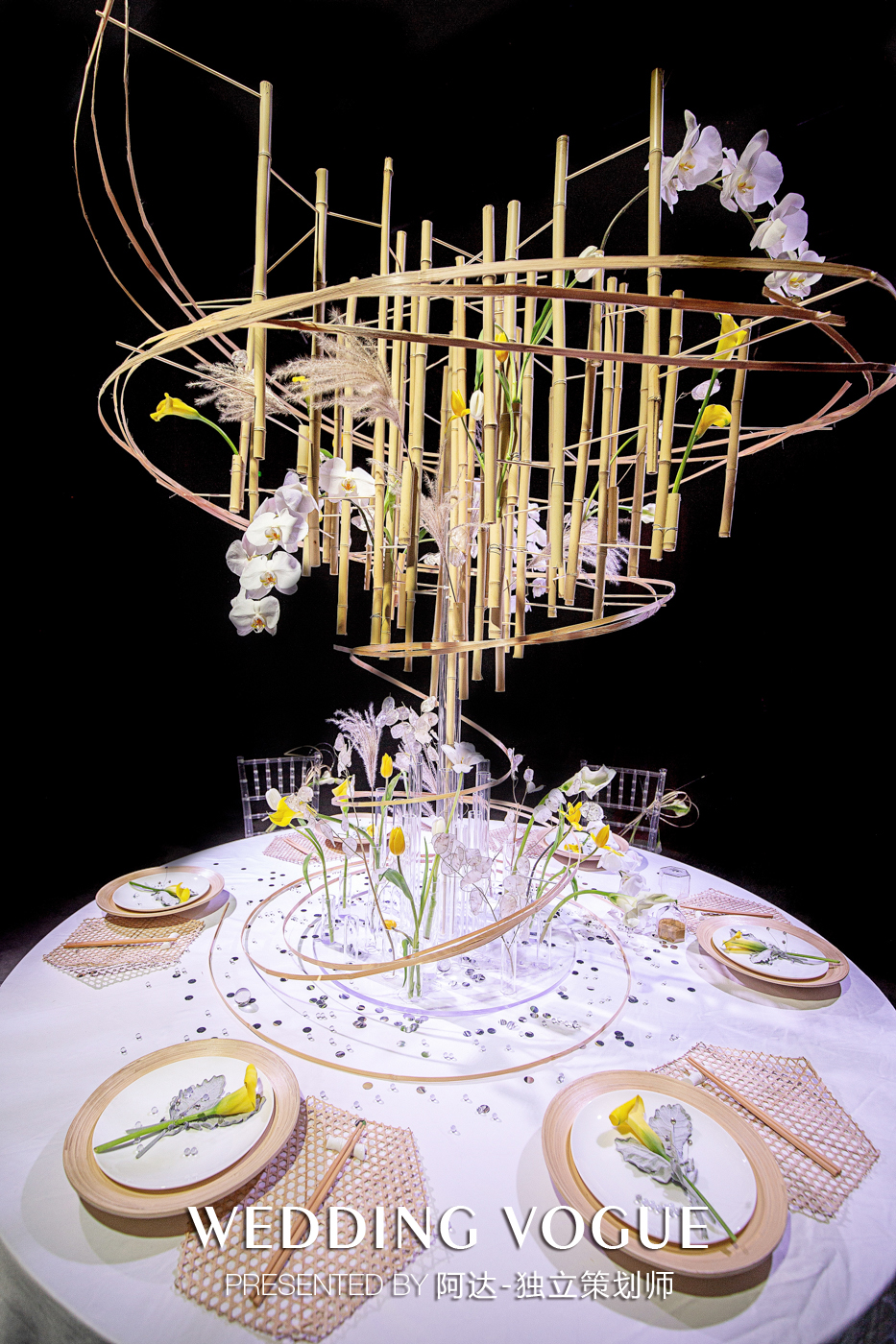 竹子与亚克力,以及玻璃球的材质搭配使用,是旨在诠释中国新娘古典坚韧的气韵之余,也希望展现她们的纯真通透一面。同时,设计师通过一支竹竿的支撑,采用两个倒置的三角形造型,完善整体架构,让整个作品造型更加饱满与纯粹。