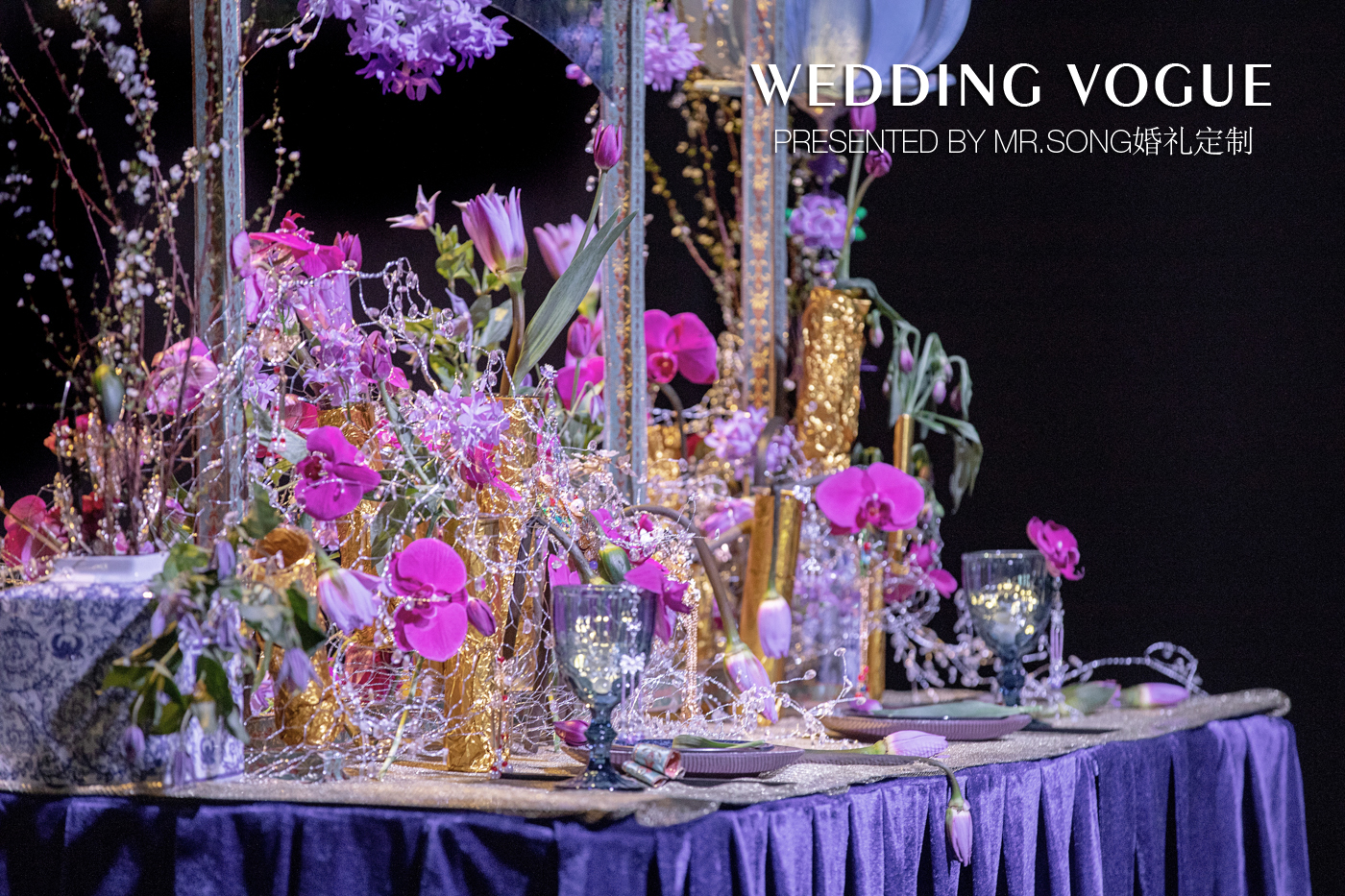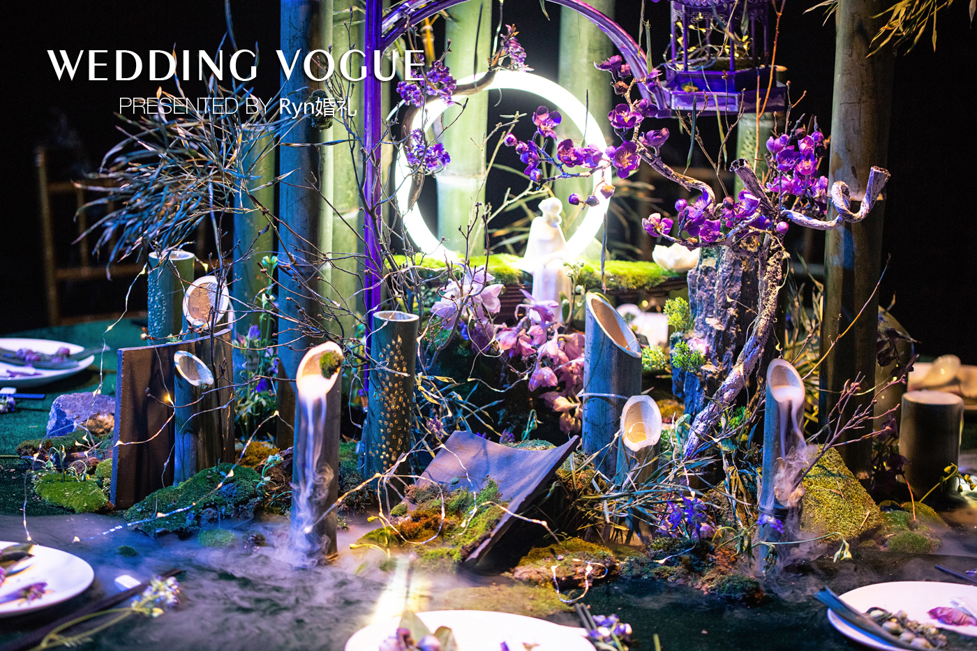 如果说天空上的星光、凤凰于飞是浪漫与爱情的象征,那么海底中沉睡千年的美人鱼,则是需要被爱情唤醒的一种美好。设计师的设计初衷是希望通过璀璨的古代发簪,以六角网打结而成的美人鱼尾巴,斑斓浪漫的紫色系花等,寓意美好与梦幻的元素,来祝福每一位中国新娘,都能被拥有美满浪漫的爱情。