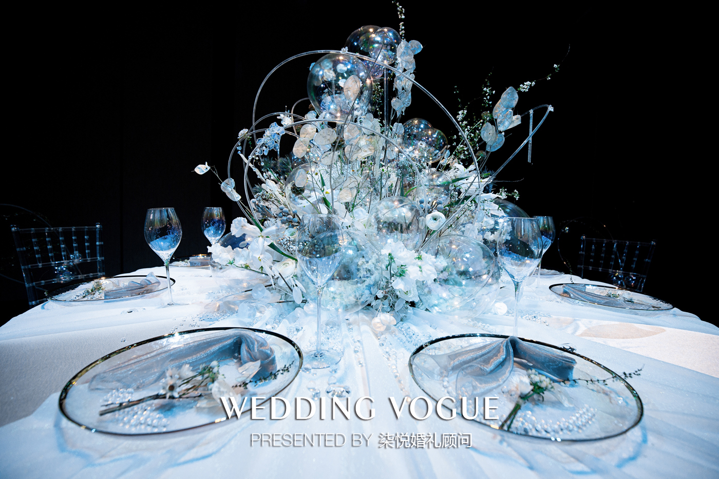 纯粹与灵动,是柒悦婚礼所理解的中国新娘印象。所以在此次设计中,设计师以添加了镭射反光基底的透明球形为主设计元素。这样的设计形式让整个桌花更富有现代感和前卫性。而浅色调花材,以及中式发簪的璀璨配饰,也让桌花整体显得灵动活泼。