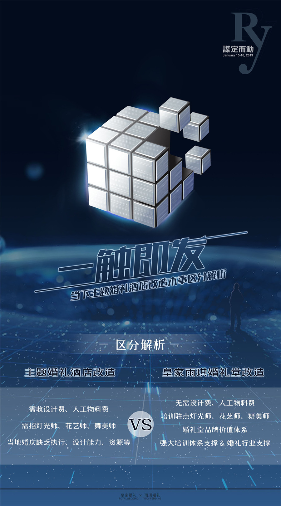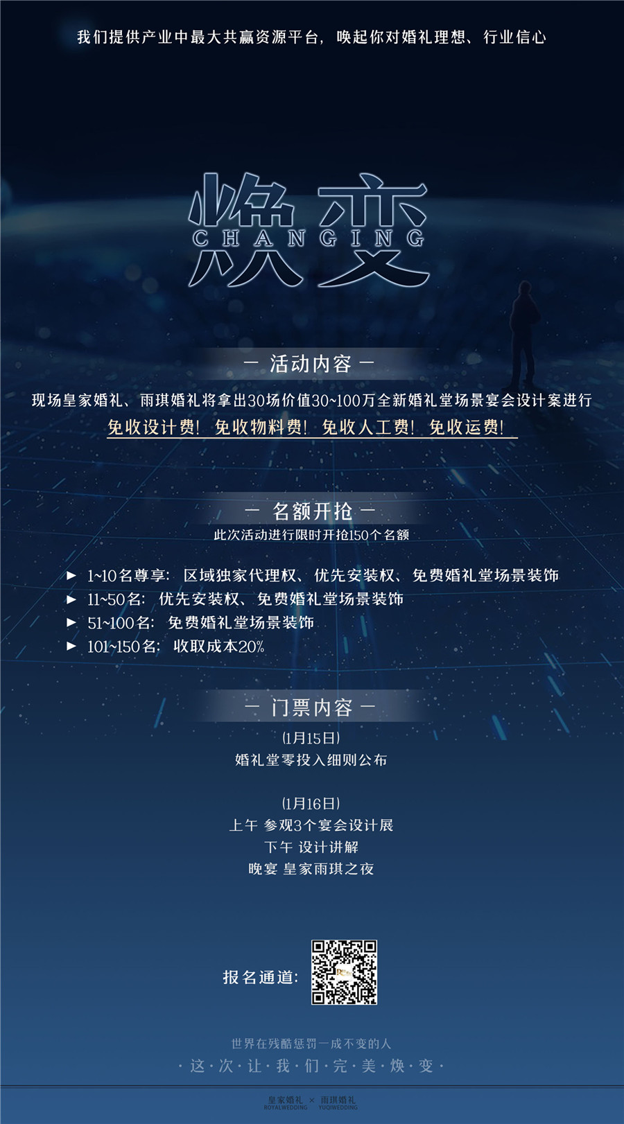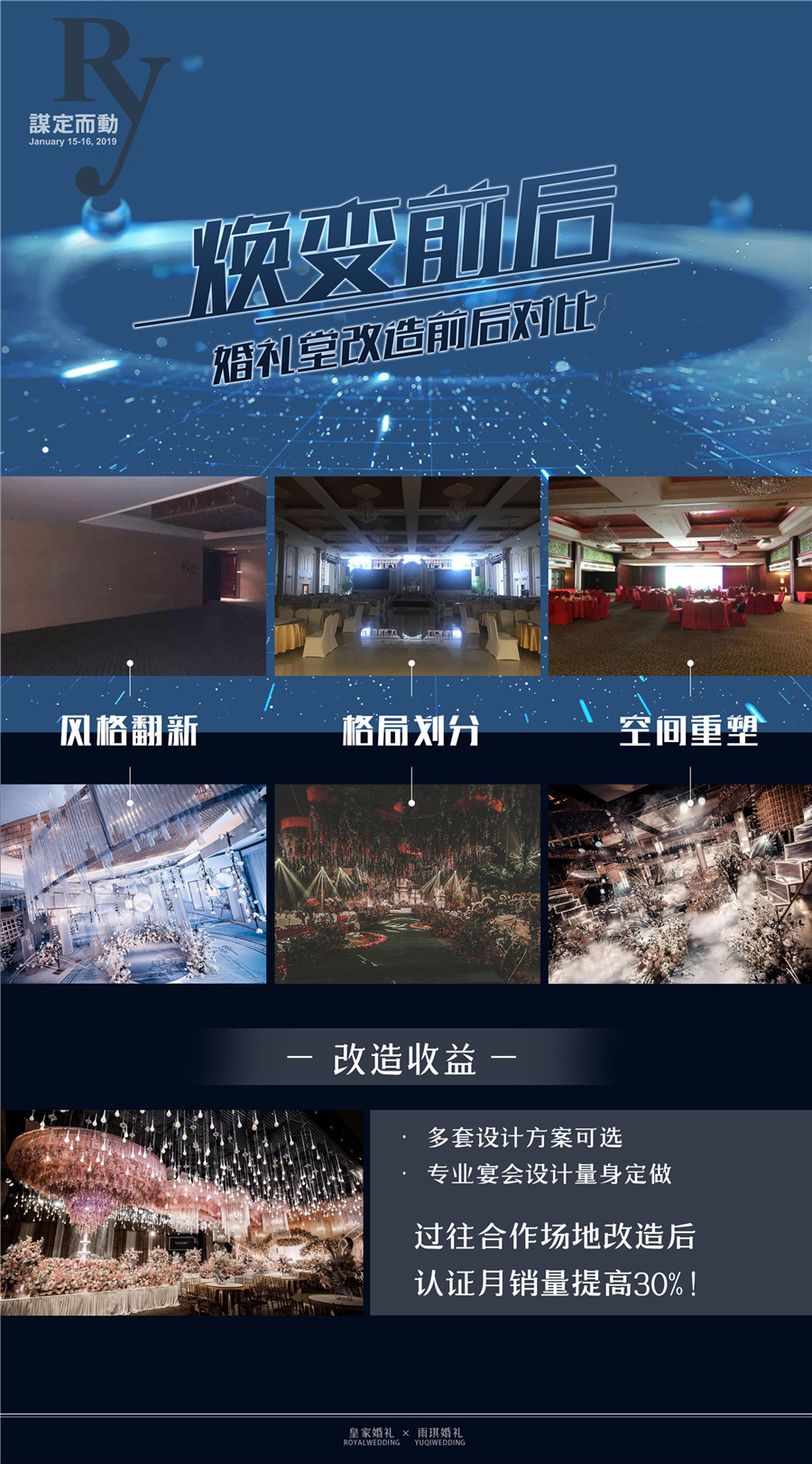 皇家婚礼研究院此次主题酒店改造的创举:将分批提供上百套套市场价值30—100万的婚礼场景供选择。有4米以下有柱及无柱厅、5米以下有柱及无柱厅、及6米有柱及无柱厅的场景方案。每个厅每年至少有2套场景,未来我们是3—4次的更换频率。