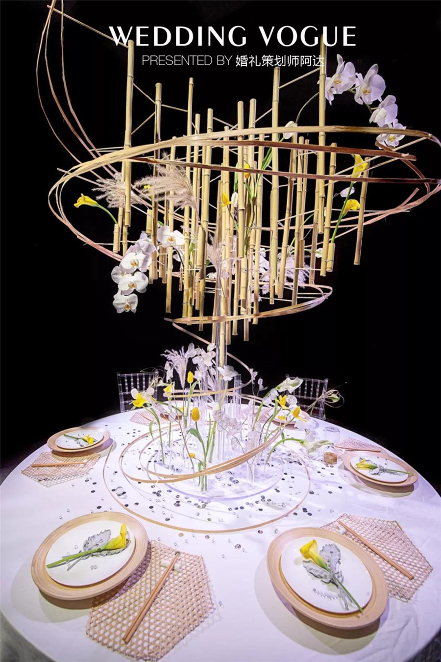 花艺上与著名花艺师王大海合作,选用兰花和白色郁金香,体现出纯真圣洁的爱情。而在整体构架中运用到榫卯结构,通过竹子与竹签的穿插进行支撑,不用吊顶便能支撑起整个构造,纯粹而完美。看似随意却经过精心摆放的花朵馥郁芬芳,沁人心脾。