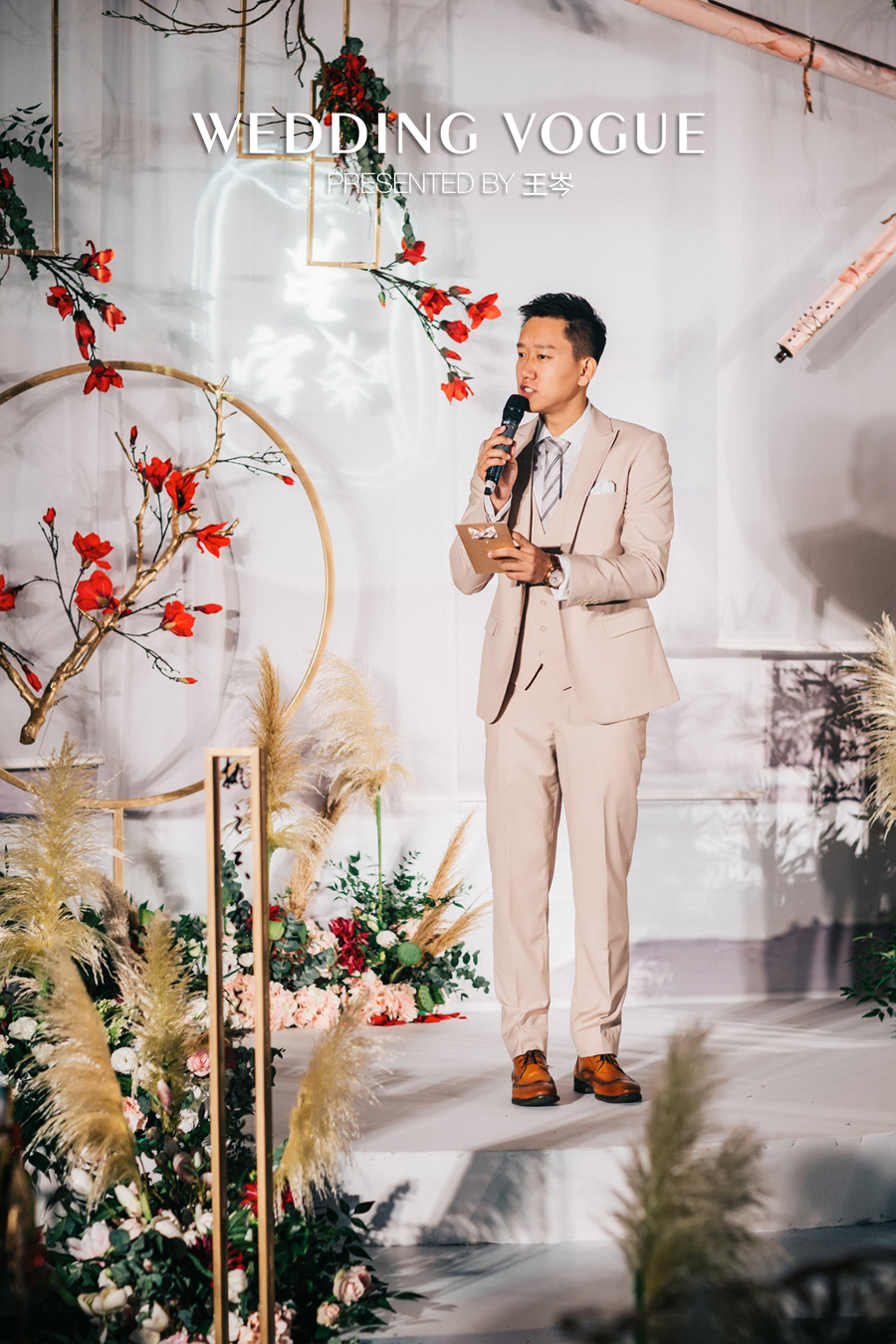 这种满足是源于王岑十年有余的专业素养积累,让他在有众多一线明星艺人和表演界前辈在场的婚礼中,依然游刃有余的把握着现场的节拍及情感之所在。特别是与证婚人赵薇沟通时那种愉悦的氛围,更为婚礼高雅的格调承上启下。