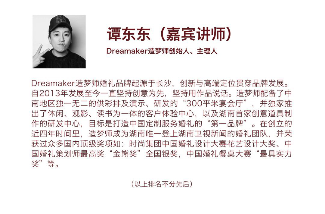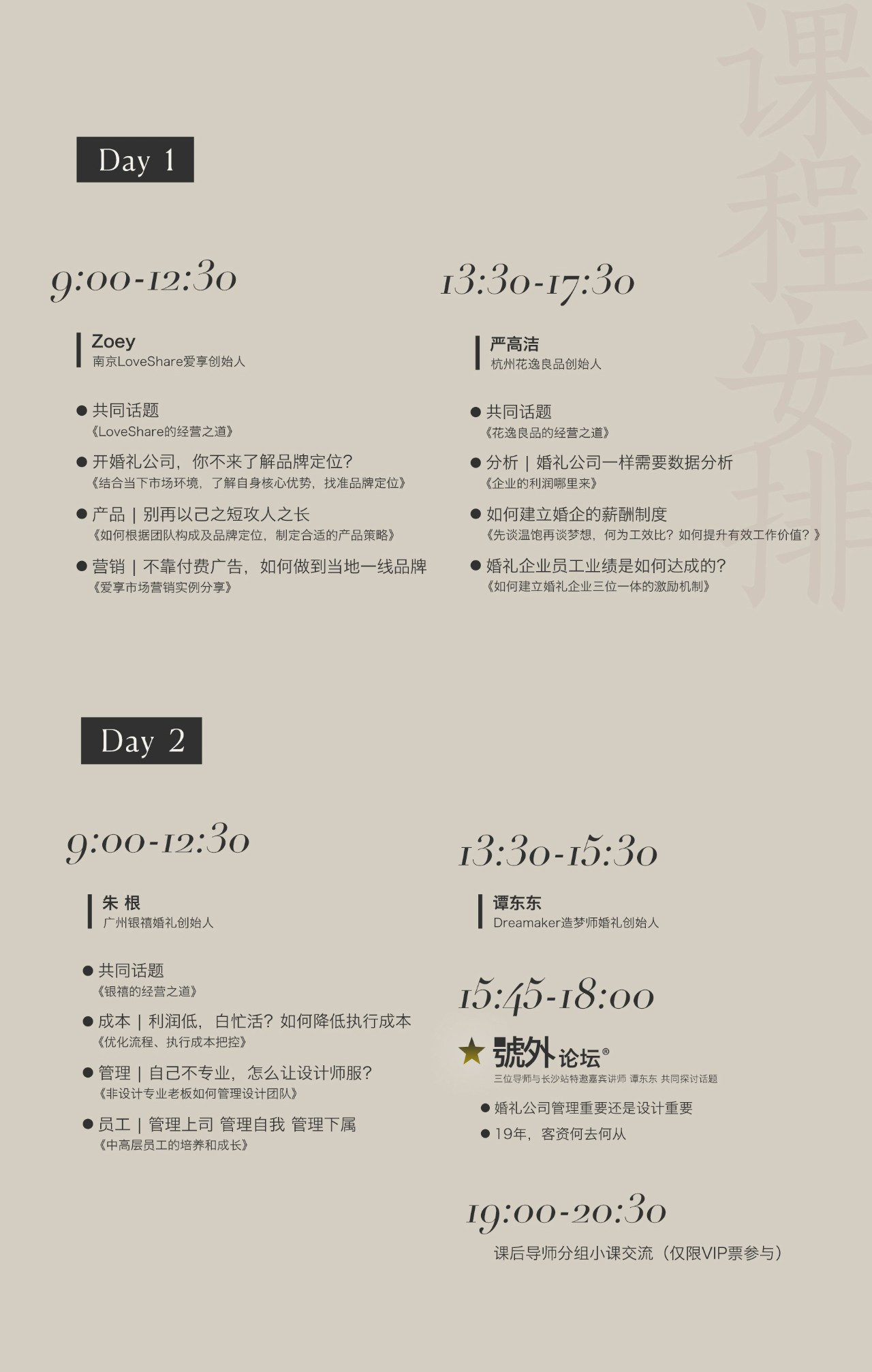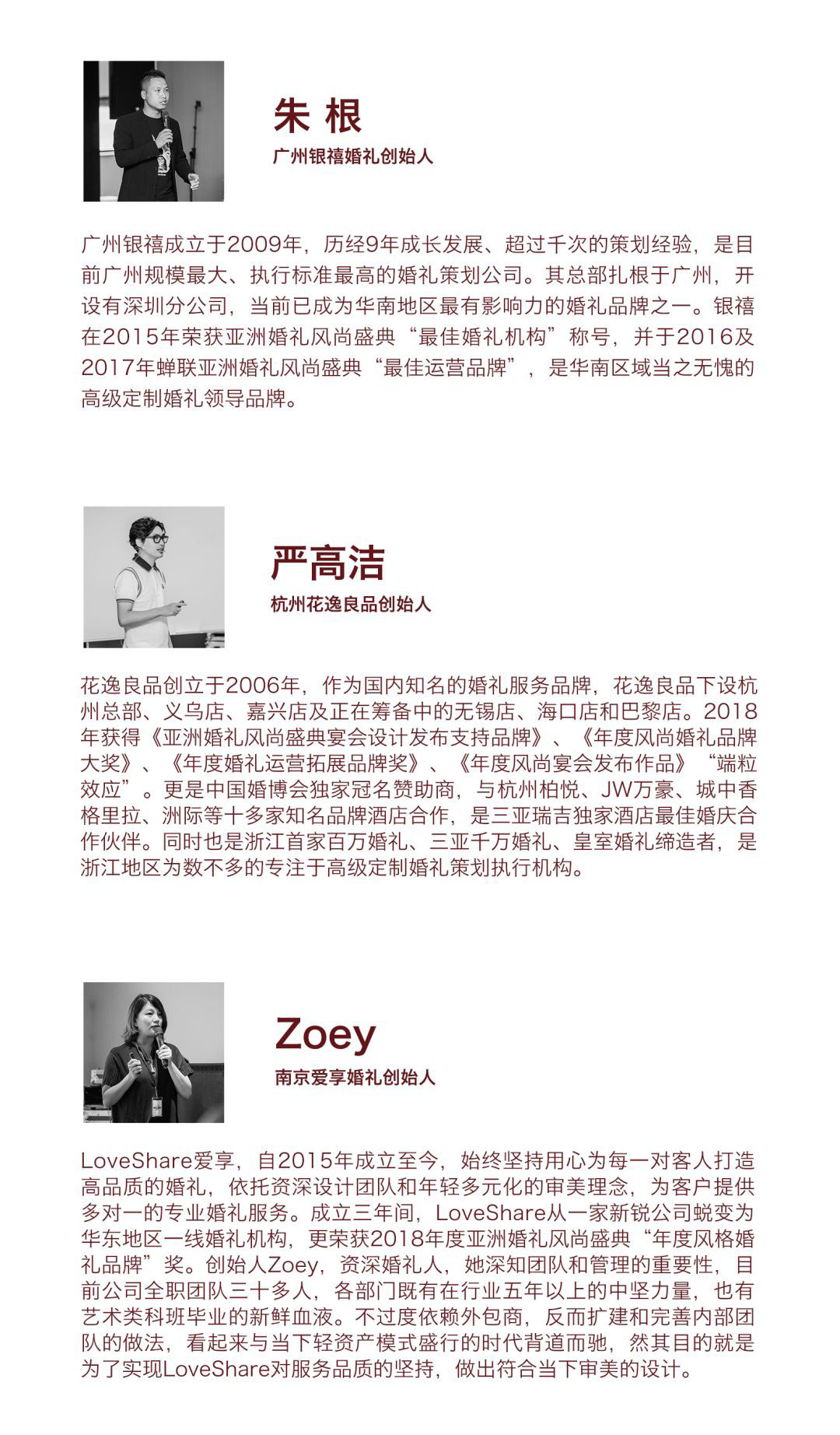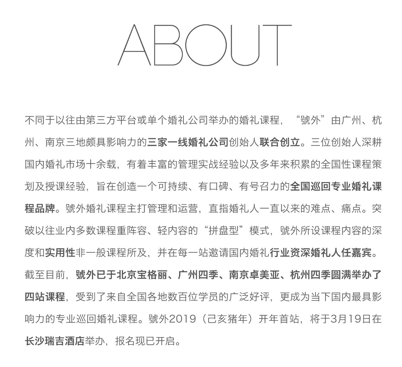 由广州,杭州,南京三地颇具影响力的三家一线婚礼公司创始人联合创立的专业婚礼课程品牌【號外】,致力于帮助婚礼企业及婚礼人提高自我水平,课程直击婚礼人的痛点难点,与婚礼人共同迎接婚礼行业新一年,新形势下的挑战,帮助其在未来激烈的市场竞争中游刃有余。