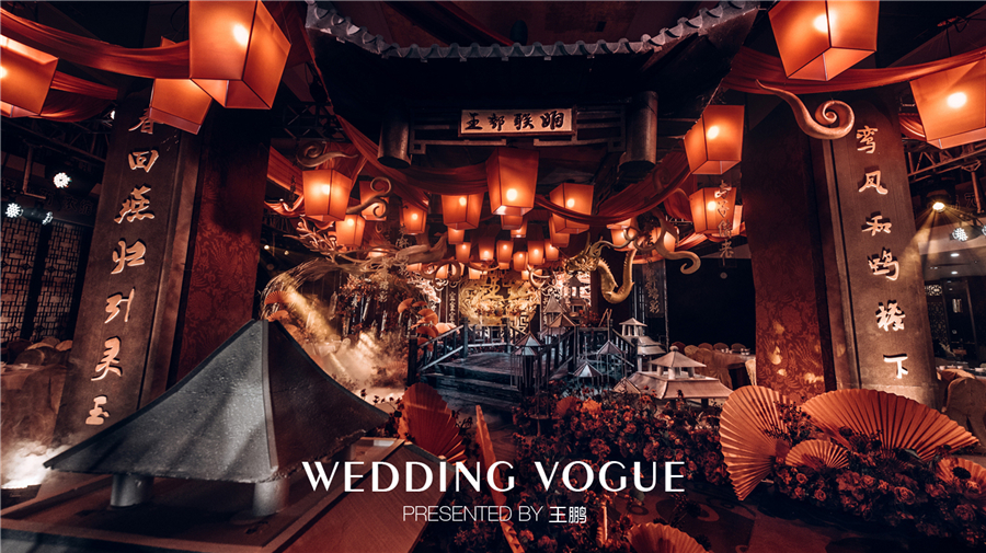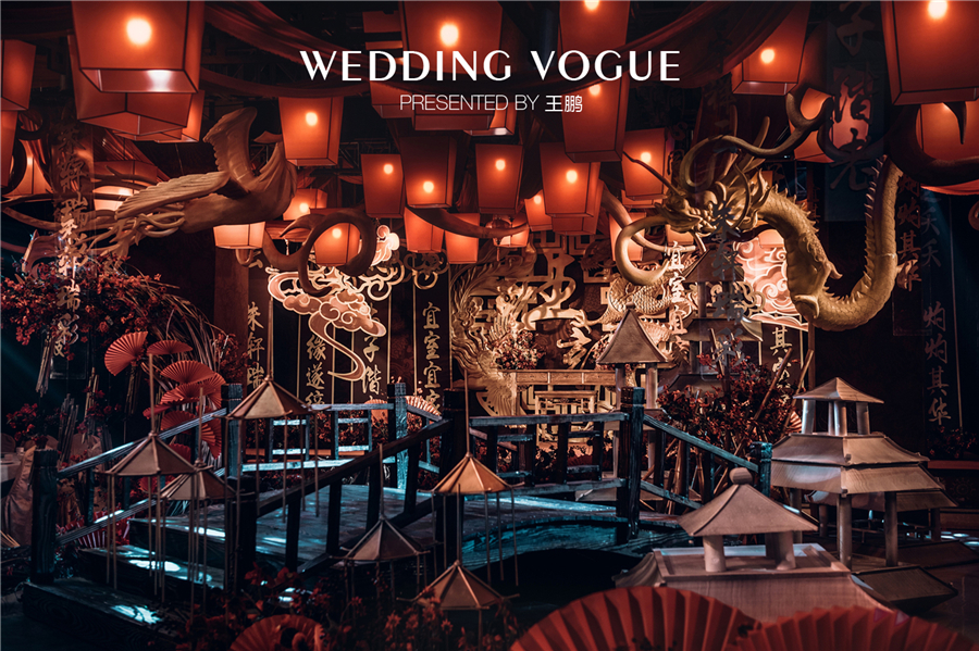 在道具的选择上,王鹏始终认为,不同的材质会给婚礼带来不同的质感。因此这场婚礼中,有垂挂于空中的亚克力板,泡雕的屋脊、龙凤,还有铁艺的路引与实木的桥......