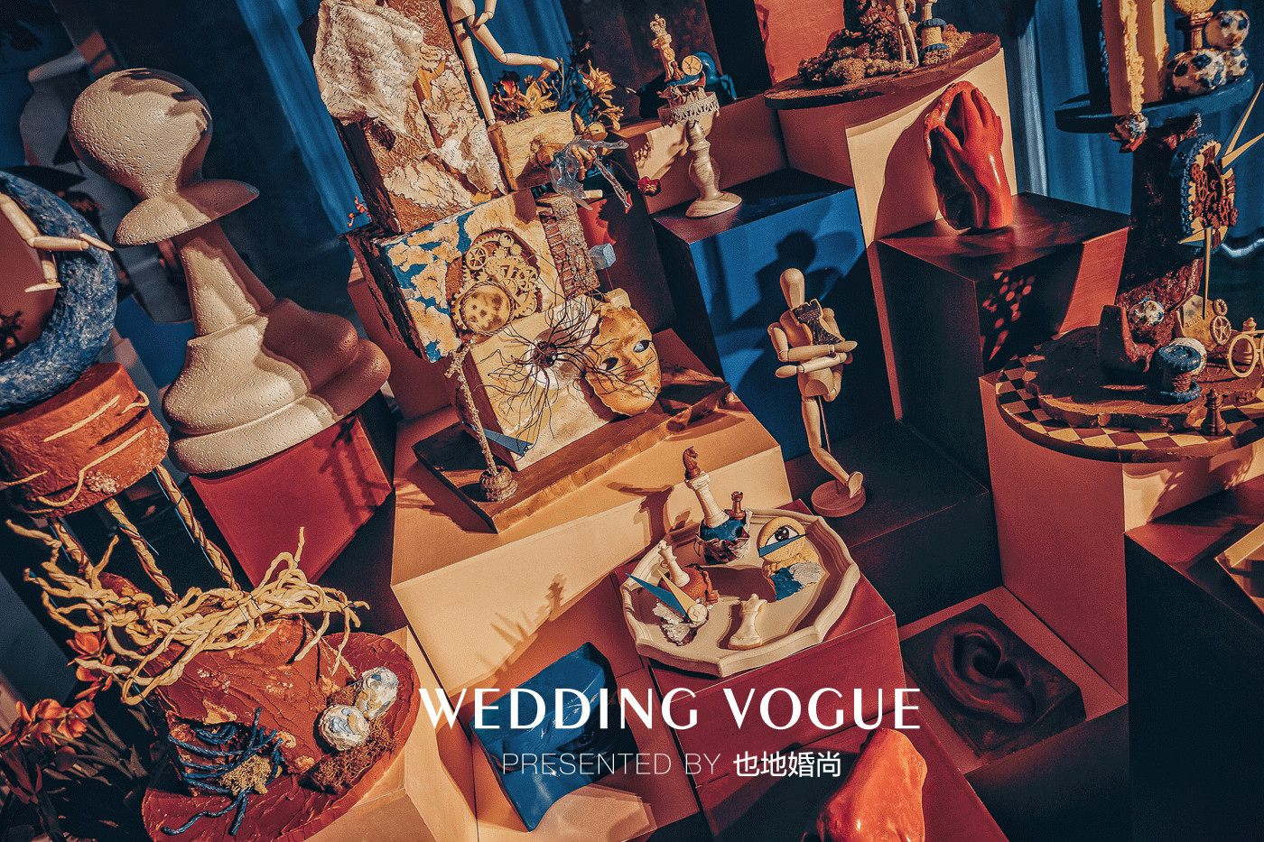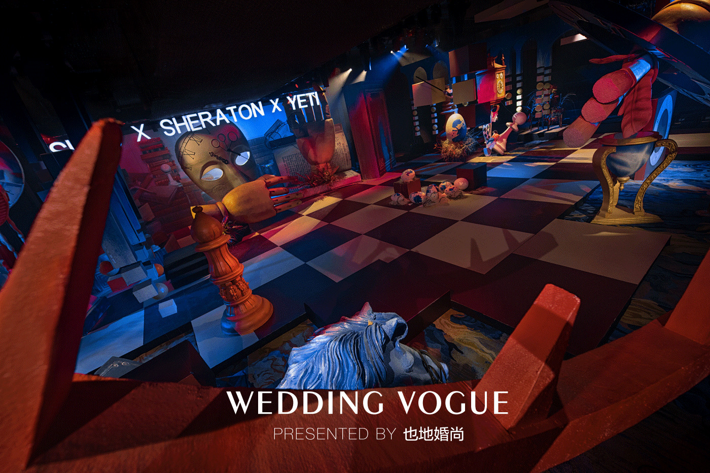 所以在现场的布置上,也地婚尚打破认知,运用了很多反常规的思路来体现,例如破碎的棋盘,失重倒置的棋子与装置,以此来表现一种混乱的无迹可寻,寓意婚姻中的不可控和杂乱无序。