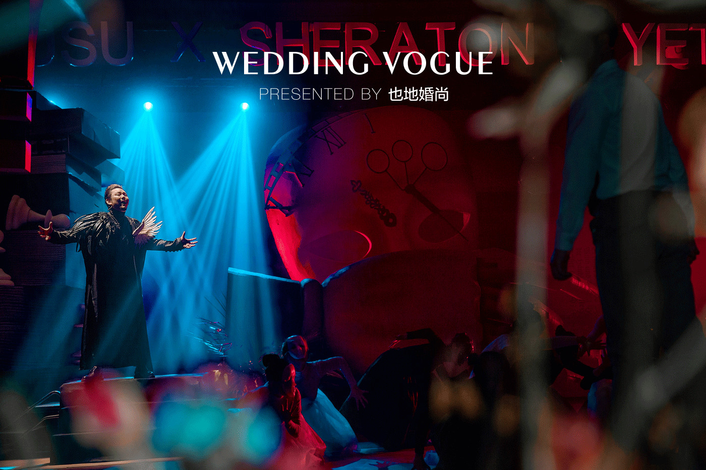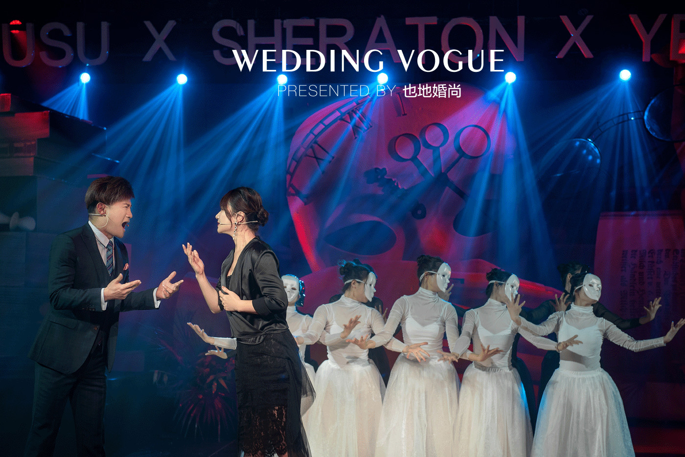 婚礼秀开始,主持人以一种分散站位的方式来开场和报幕,这样的设计也是为更好的对不同观点主题性进行阐述,并且渲染出一种代入感。
