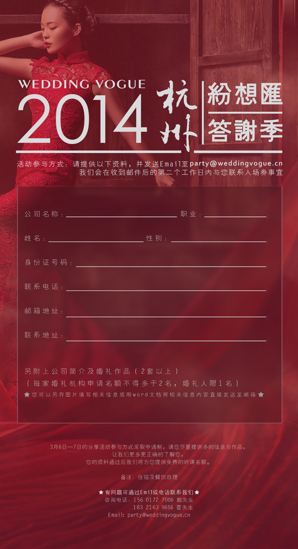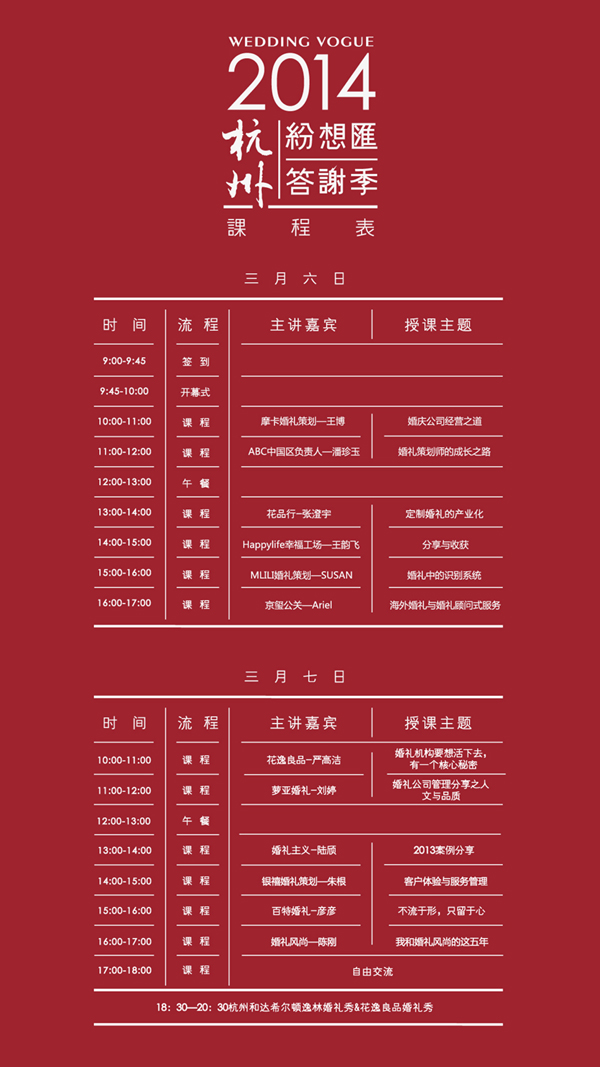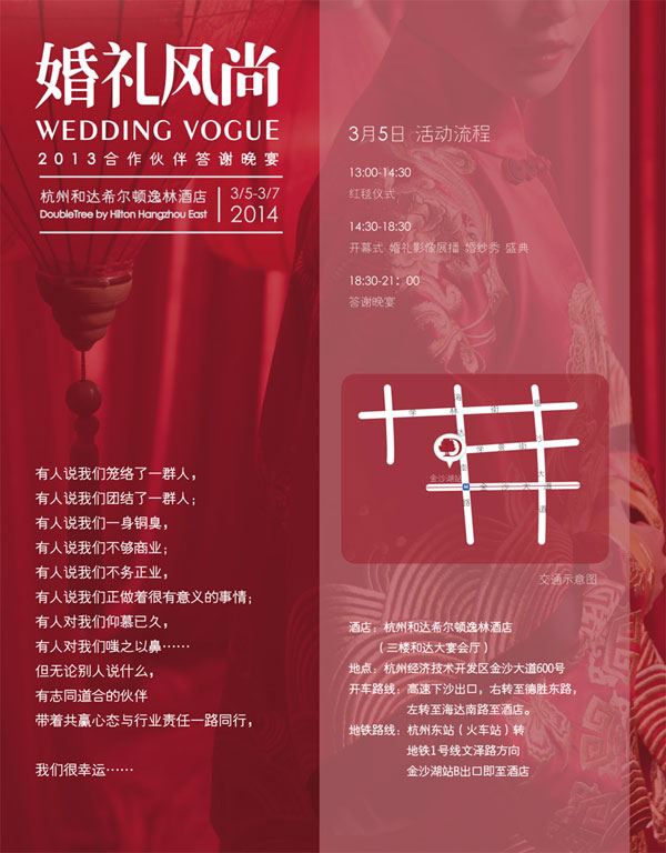 2014年婚礼风尚婚礼人盛典&2013婚礼风尚合作伙伴答谢晚宴将于2014.3.5-3.7在杭州和达希尔顿逸林酒店举行。3月5日为婚礼风尚盛典暨全国合作伙伴及好友答谢晚宴(邀请制),3月6日-7日为婚礼风尚杭州纷想汇(申请制无费用)我们期待与优秀的志同道合的您相聚杭州!