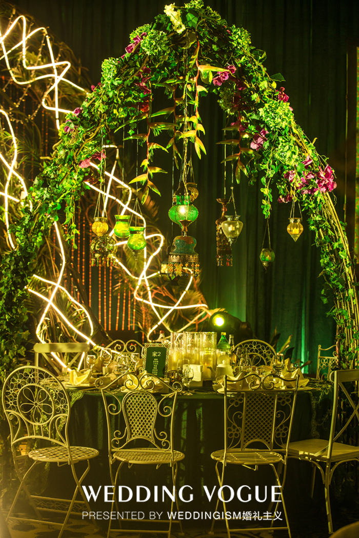 有了奇思妙想,还需要有愿意帮助你去实现它的新人。NaNa说,他们会经常想办法引导客人去尝试一些很棒的有趣的设计风格。前不久有一场是网络红人陈老师的婚礼,她在最初沟通的时候,就说想要传统的欧式森系风格。这个时候,NaNa就建议她要不要尝试一些新的风格,异域风情的或者摩洛哥风格的,做一个热带雨林,这样颜色就会比较丰富,会有一些有趣艳丽的植物。新颖的想法很快就跟新人达成统一,最终呈现出了别有一番滋味的森系婚礼。这也是NaNa,是婚礼主义一直的追求,那就是做出不一样的东西,让新人或者同行知道,很多奇思妙想都是可以实现的,婚礼还有更多可能性。