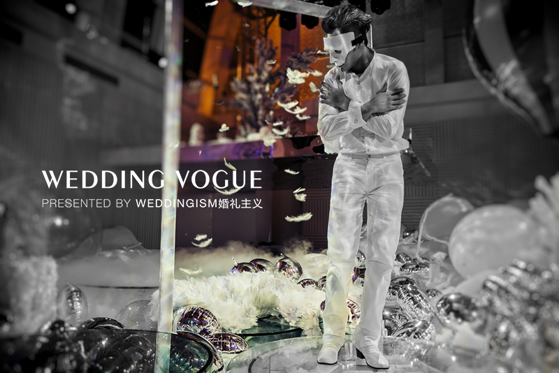有同行说婚礼主义像是“开挂了”,出作品的频率特别高,同时在布置上会加入很多新型材料,帮助新人和同行打开眼界,然后再引领婚礼行业的某种新潮流。不止是一个人好奇,这些灵感都是从何而来。而有的人可能天生就具有某种天赋和超能量,就像NaNa,她夸张到睡觉都能睡出灵感,梦见方案,然后第二天起来把方案画出来。婚礼主义的一场婚礼秀,就是NaNa的梦境。她梦见好像世纪末了,所有事情被毁坏,新的文明出现,带来一种新的生活。餐桌是倒立过来悬空着,吃饭是在荷叶上面,其中有个男主戴着面具,然后面具一点点的破掉,脸出现了,那时候他就找到真爱了。再通过对梦境的加工,NaNa做了五幕不同的感觉,表达人的五种不同情感和欲望,这就是那场婚礼秀的核心。