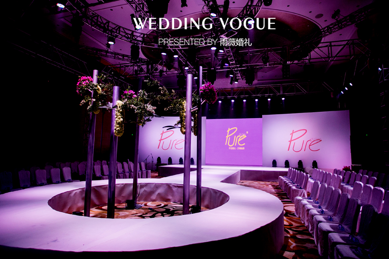 婚典开场,主秀场大门隆重开启,简约典雅的会场呈现在嘉宾们眼前。主舞台是一个同心圆设计的T台。同心圆自古象征美好,有相互包容,缘定今生之意。它从中心向外辐射,揭示了美好生活蓬勃壮大的过程。舞台中央是倾泻而下的鲜花瀑布,赋予舞台充实感的同时也为秀场增添了不少色彩。