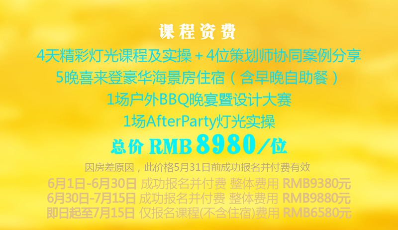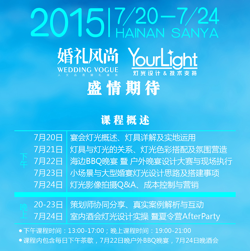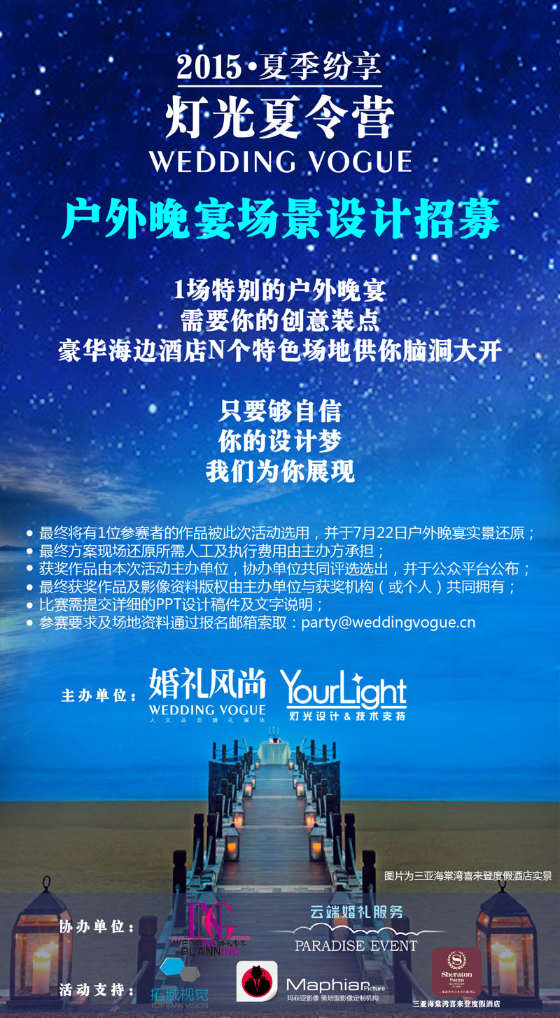 和去年首届“灯光夏令营”相比,本次“灯光夏令营”新增了After Party宴会设计发布,将由协办单位ING私人婚礼专享定制现场进行宴会设计发布,并与灯光完美结合,为学员提供现场实操。此外,我们还准备了浪漫的海边BBQ晚宴,针对此次晚宴的设计,我们在前期将从全国婚礼机构及个人中进行BBQ晚宴现场设计方案的招募及选拔,获奖者将由主办单位和协办单位共同选出并于公众平台公布。只要你够自信,有梦想,我们就能让你的创意得以在豪华海边酒店的多个特色场地做独特展现。即日起,你可以通过婚礼风尚的party邮箱报名参与本次设计大赛,具体详情请见海报。