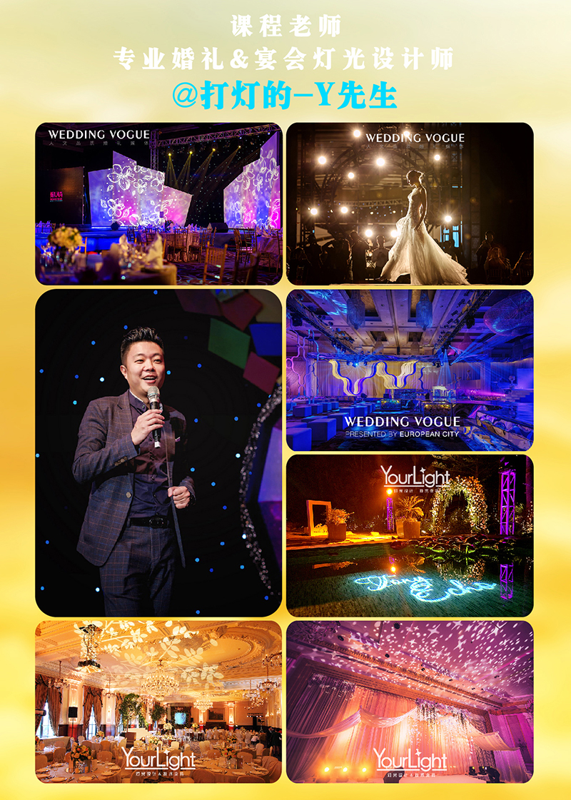 此次婚礼风尚联合国内知名灯光师袁理(@打灯的-Y先生)再次为大家带来为期5天的(7.20~7.24)的专业灯光课程。从宴会灯光概述、灯具的详解和实地运用,到灯具与灯光的关系,再到灯光色彩搭配与氛围制造,360°度全面讲解灯光运用的理论实践、成本控制及营销,为各种婚礼的完美呈现做专业的保障。