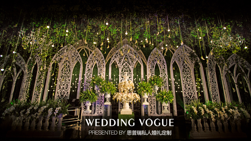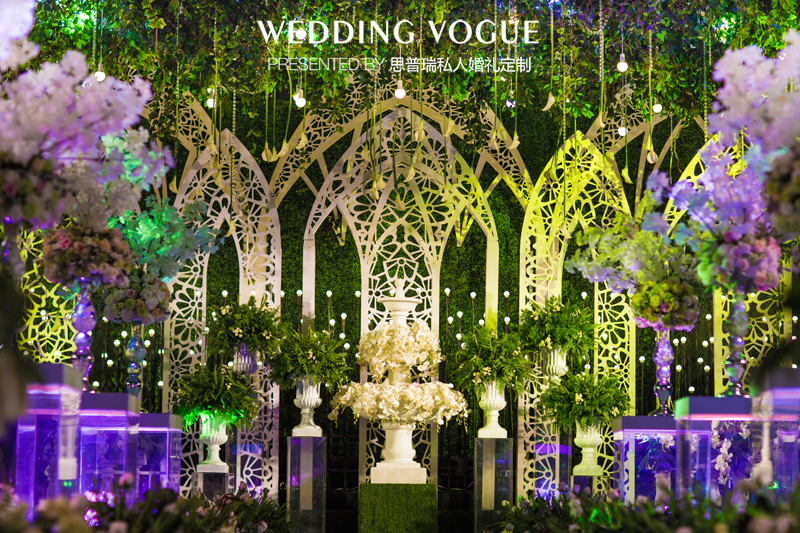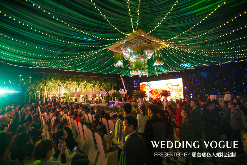 凯宾森情婚礼秀整体布置绿色为主、咖色、白色为辅。将森系设计元素融入到整个宴会厅的上中下、前中后等九维空间中。舞台上丛林中若隐若现的教堂,缤纷璀璨的水晶,参差错落、绵延起伏的绿植萦绕。宴会厅末端唯美浪漫的全息纱与从天而降的新娘出场设计,宴会厅顶部墨绿色的大包幔与星空灯设计,耳畔惬意传神的流水鸟鸣声,使宴会厅的每一个点位都散发着浓郁的森系风情,给来宾献上一份精彩绝伦的视听嗅觉盛宴。