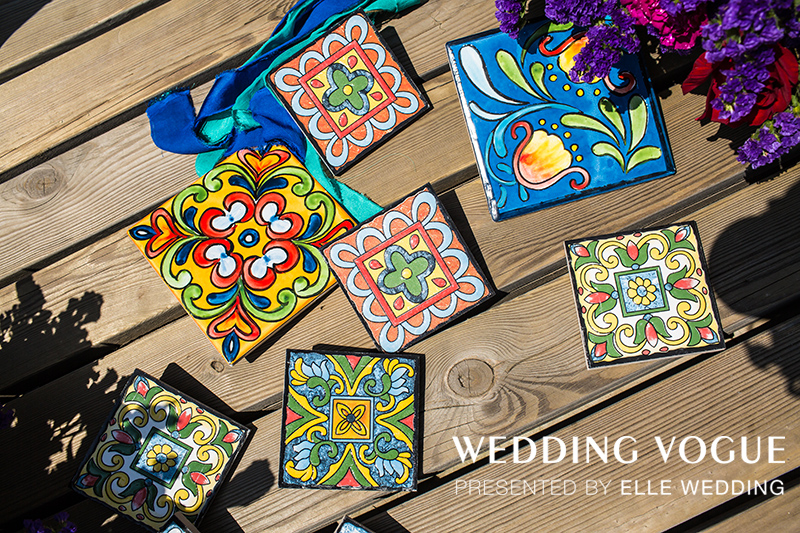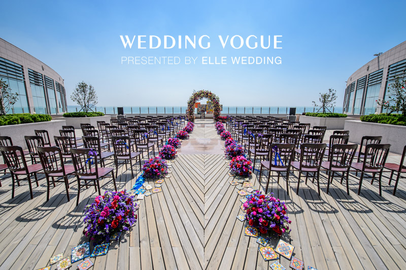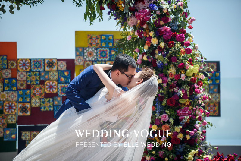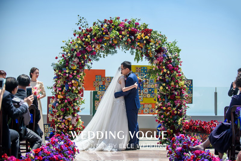 婚礼现场是由三个独立空间组成,户外仪式区+外厅+内厅,这样的大空间需要合理的设计布局。首先在户外的露台上,以碧海蓝天为自然背景,艾俪婚礼采用自然花卉为材料,并充分融入了新人的故事。在学生时代,新郎就告诉新娘,等结婚后带她去威尼斯度蜜月,如今,因为种种原因没能实现这一心愿。在户外仪式区的设计上,艾俪将威尼斯的五彩斑斓带入了婚礼,采用了威尼斯彩色的马赛克花砖作为路引及背景的元素之一,又将威尼斯的另一大特色"贡多拉"搬进了现场,这个有着千年历史的轻盈纤细、造形别致的小舟,满载着鲜花静静地停靠在仪式区,见证新人的幸福。