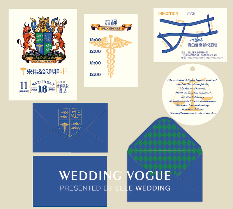 当新人将自己的想法告诉艾俪婚礼后,所有的想法都1:1的完美实现。之前自己所画的logo手稿变成了色彩艳丽的个性图案,出现在婚礼的每一个大小角落。logo的图案不仅美观,寓意也非常深刻。与新人的职业和喜好有着密切的关系。新郎是法医,新娘是医生。图案上的牛和小鹿分别代表两个家族,其中牛还代表新郎的属相和星座,小鹿代表新娘;天秤代表法律,蛇杖代表医学,因为两个家族中都诞生了很多医生;波浪则是他们生活的城市青岛;最下面的一句“NEVER LOSE HOPE永不放弃”成为了他们整个家族的家训、徽章。