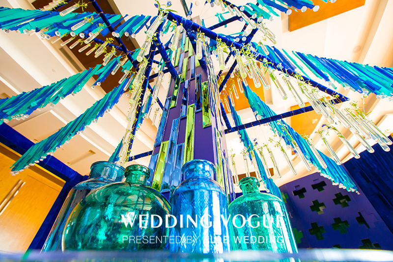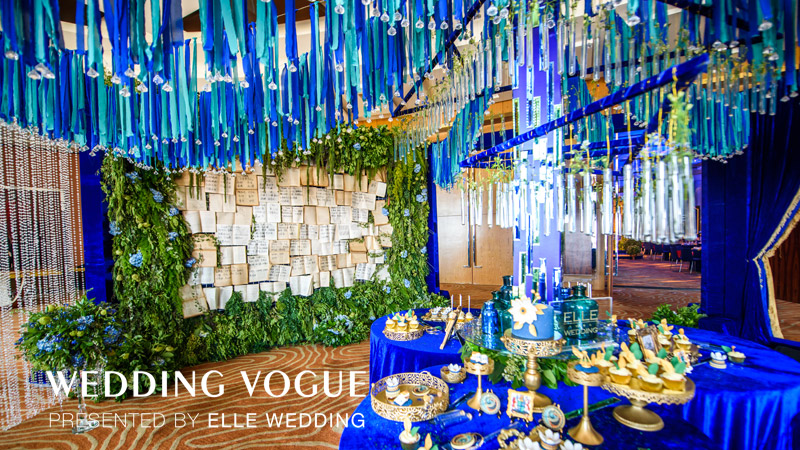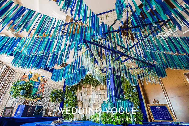 走进大厅,瞬间惊呼于满眼的色彩碰撞,这里呈现了新人更多的故事及喜好。艾俪婚礼大胆的运用蓝+绿为主色调。将甜品区、席位区、合影区分别设置在同一个立体空间内,合影区巧妙地运用了十字花元素,以呼应新人医生的职业元素。新娘喜欢有层次感的布置,艾俪婚礼大量的使用了复古箱子与花卉的结合,打造了一处参差错落的别致景观。在花丛中,你可以发现一把开出花朵的吉他,那是新郎对于音乐的喜好,在婚礼现场,可以听见新郎亲自为新娘的激情弹奏。箱子里,有着职业象征意义的权杖安静的躺在那里,这是由艾俪婚礼采用珠宝、皇冠等元素为新人定制的精美手捧花。