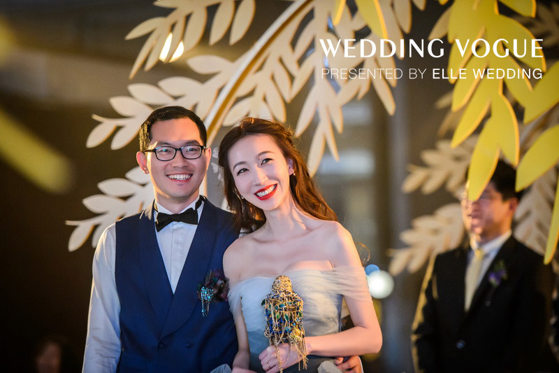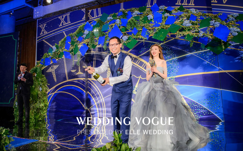 宴会厅延续了整场婚礼的大气,在舞台上运用了时间的轴线和月桂冠作为主元素。 以此记录两个人从开始到现在,经历过时间的洗礼和沉淀后的幸福归宿。当新娘穿上蘭诺灰色蓬蓬拖尾纱,手持权杖捧花走进门的那一瞬间,所有的嘉宾都被新娘的美所震撼,安静地倾听俩人的动人故事,并为此刻的幸福做有力的见证。