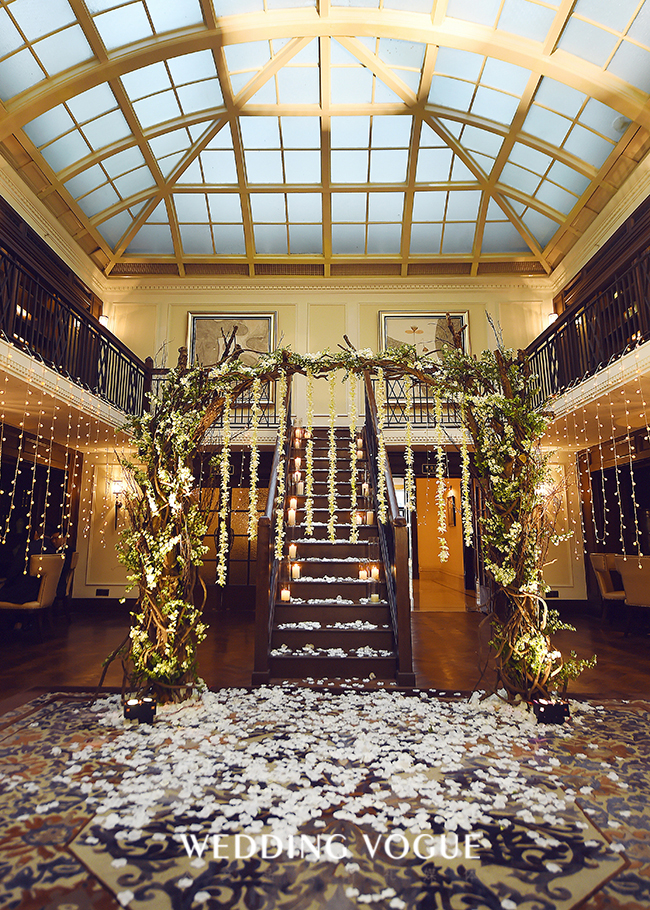新人喜欢简单自然的色调,并且华尔道夫酒店本身也带有着欧式古典的感觉。所以整场婚礼以森系为主基调,带着优雅与华丽,融合宴会灯光,筑起心底的“仲夏夜之梦“。