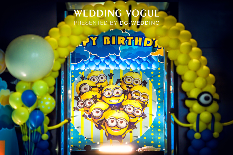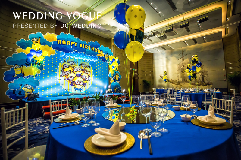 此次婚礼秀的秀场由三部分组成,另外两部分分别以宝宝宴和美式田园风格为主。宝宝宴位于酒店的侧厅展示,主题采用了《小黄人》的元素,DC大蔡wedding的负责人张洁表示,7月份《小黄人》即将上映,这是这次宝宝宴灵感的主要来源,区别于主厅的海洋系蓝色风格,宝宝宴的布置加入了更多的黄色,也使得现场多了几分童真与趣味。