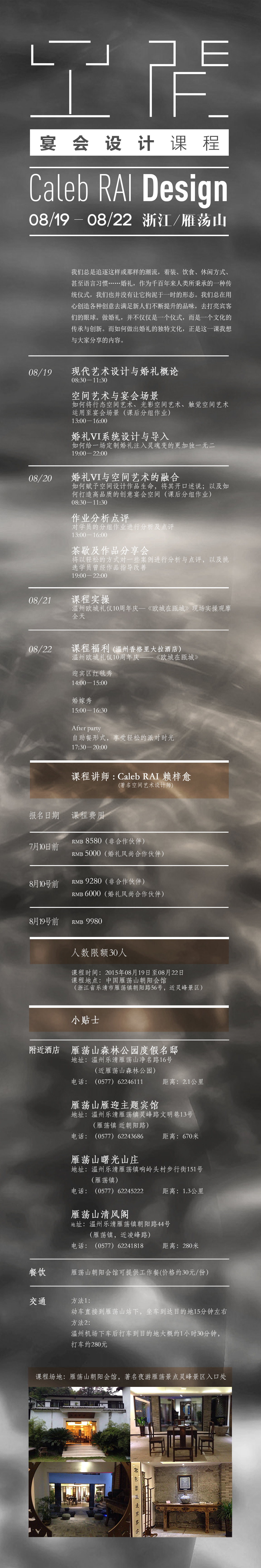 2015年8月19日到8月22日,婚礼风尚联合温州欧城礼仪婚礼设计总监 —— Caleb RAI 赖梓愈 将在中国浙江进行为期4天的空间与宴会设计课程。
